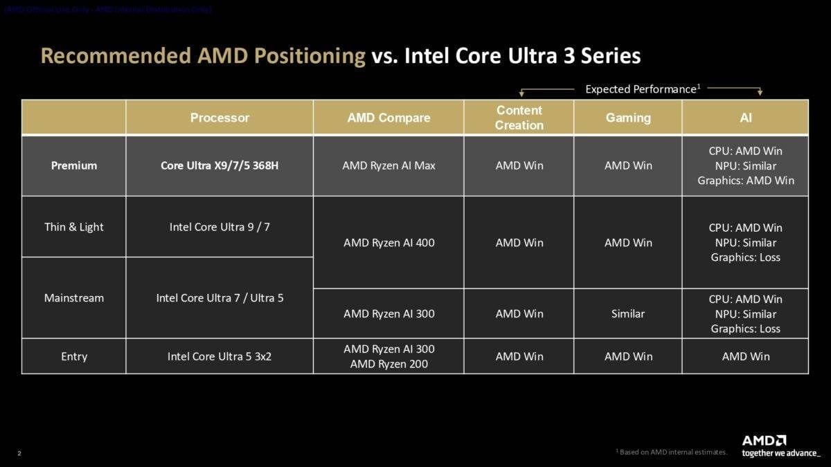 Trong tài liệu "Định vị so với Intel Panther Lake" mới nhất, AMD đã chia thị trường máy tính xách tay thành 4 phân khúc chính: Cao cấp (Premium), Mỏng nhẹ (Thin and Light), Phổ thông (Mainstream) và Giá rẻ (Entry). Tương ứng với đó là các dòng sản phẩm Ryzen AI Max, Ryzen AI 400, Ryzen AI 300 và Ryzen 200.