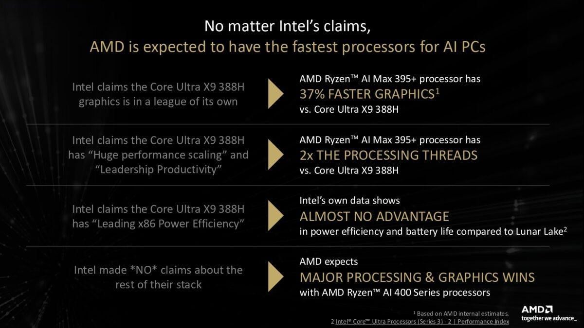 AMD cũng không quên nhắc nhở thị trường rằng, trong khi Intel tập trung quá nhiều vào một vài mẫu chip cao cấp, thì dòng Ryzen AI 400 của họ sẽ dẫn đầu về cả khả năng xử lý lẫn đồ họa ở các phân khúc phổ thông hơn. Điều này đặc biệt quan trọng khi người dùng thực tế thường tìm kiếm sự cân bằng trong tầm giá thay vì chỉ nhìn vào những con số kỉ lục của các mẫu chip nghìn đô.