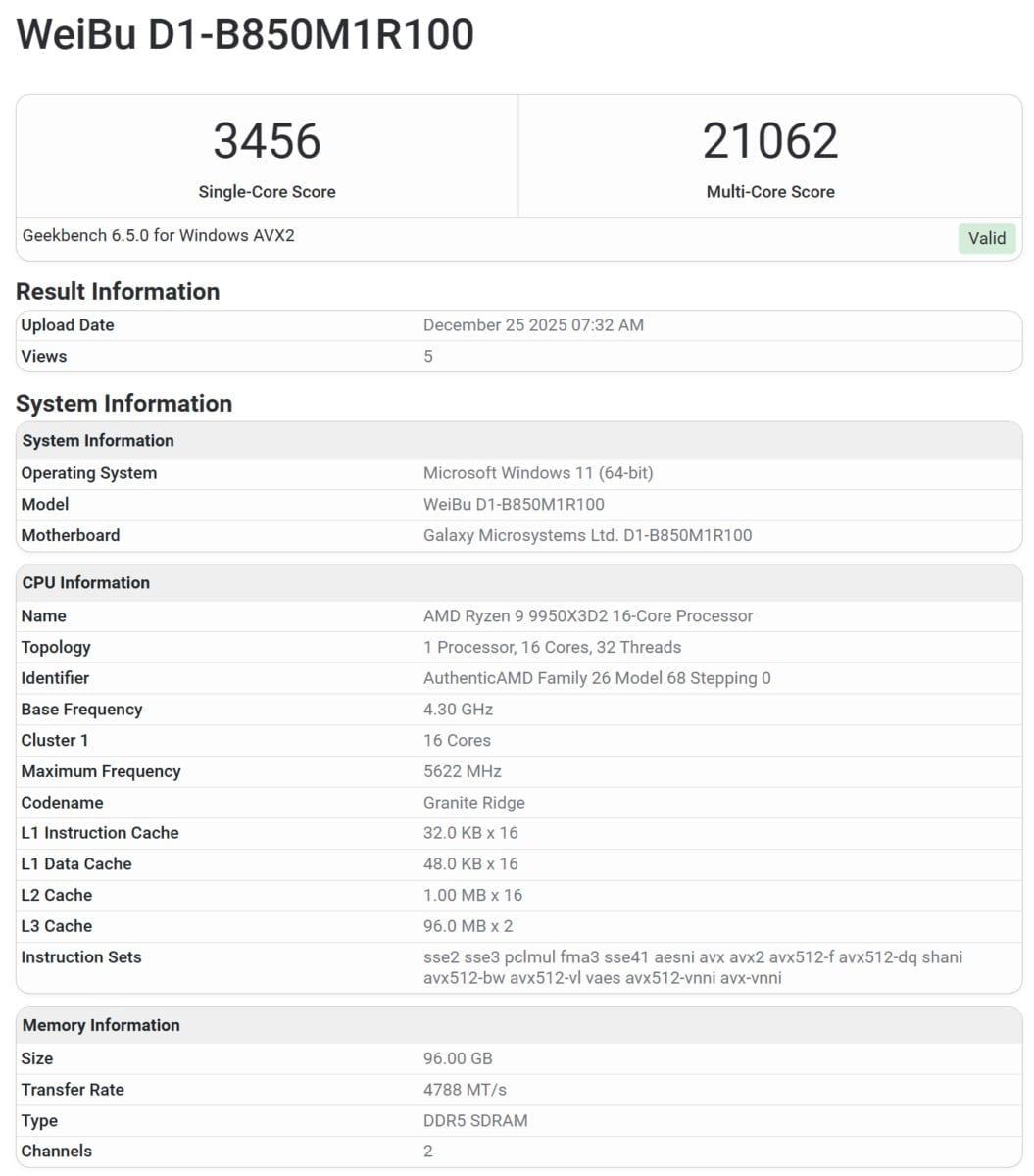 Một bài test Geekbench cho thấy CPU được chạy trên bo mạch chủ Galax B850M, đi kèm 96GB RAM DDR5 chạy ở mức 4800 MT/s với hai thanh nhớ.