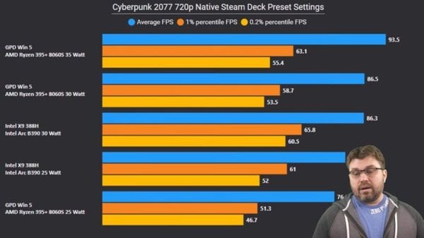Kết quả từ The Phawx tập trung vào các thiết bị cầm tay cho thấy Arc B390 có khả năng mở rộng hiệu năng (scaling) cực tốt từ mức 10W đến 35W. Ở cùng một mức công suất, iGPU của Intel thường xuyên dẫn trước Ryzen AI 9 HX 370 về cả FPS trung bình lẫn FPS tối thiểu (1% low), mang lại trải nghiệm chơi game ổn định và ít giật lag hơn.