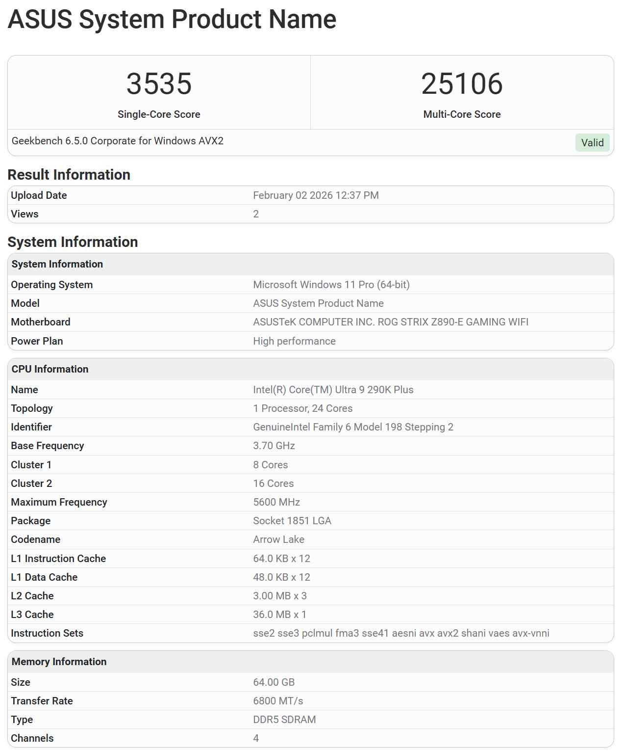 Trong bài kiểm tra mới nhất trên hệ thống sử dụng bo mạch chủ ASUS ROG STRIX Z890-E GAMING WIFI và 64 GB RAM DDR5-6800, con chip này đã cho thấy sự ổn định và tiềm năng ấn tượng. So với các rò rỉ trước đó trên hệ thống Gigabyte, kết quả lần này cao hơn khoảng 2.3% ở đơn nhân và 2.0% ở đa nhân, bất chấp việc sử dụng mức RAM có tốc độ thấp hơn (DDR5-6800 so với DDR5-8000).