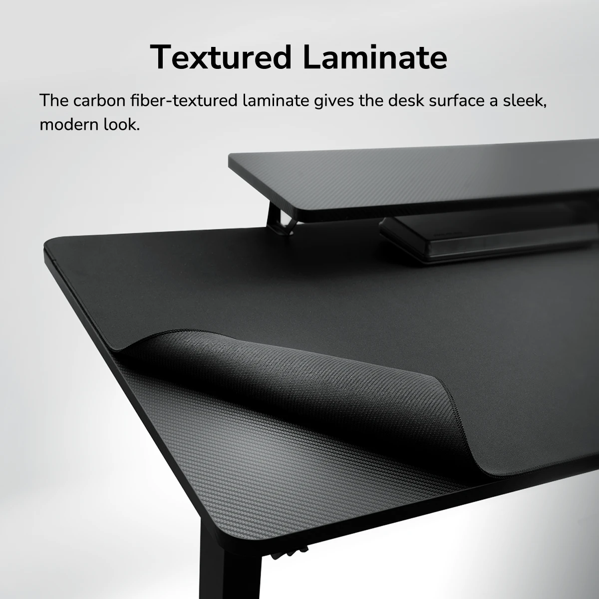 Mặt bàn kích thước 1400 x 600 mm được phủ lớp laminate vân Carbon Fiber cao cấp. Lớp phủ này không chỉ mang lại vẻ ngoài hầm hố, đậm chất gaming mà còn gia tăng độ bền, chống trầy xước và chống thấm hiệu quả, bảo vệ cốt gỗ bên trong qua nhiều năm sử dụng.