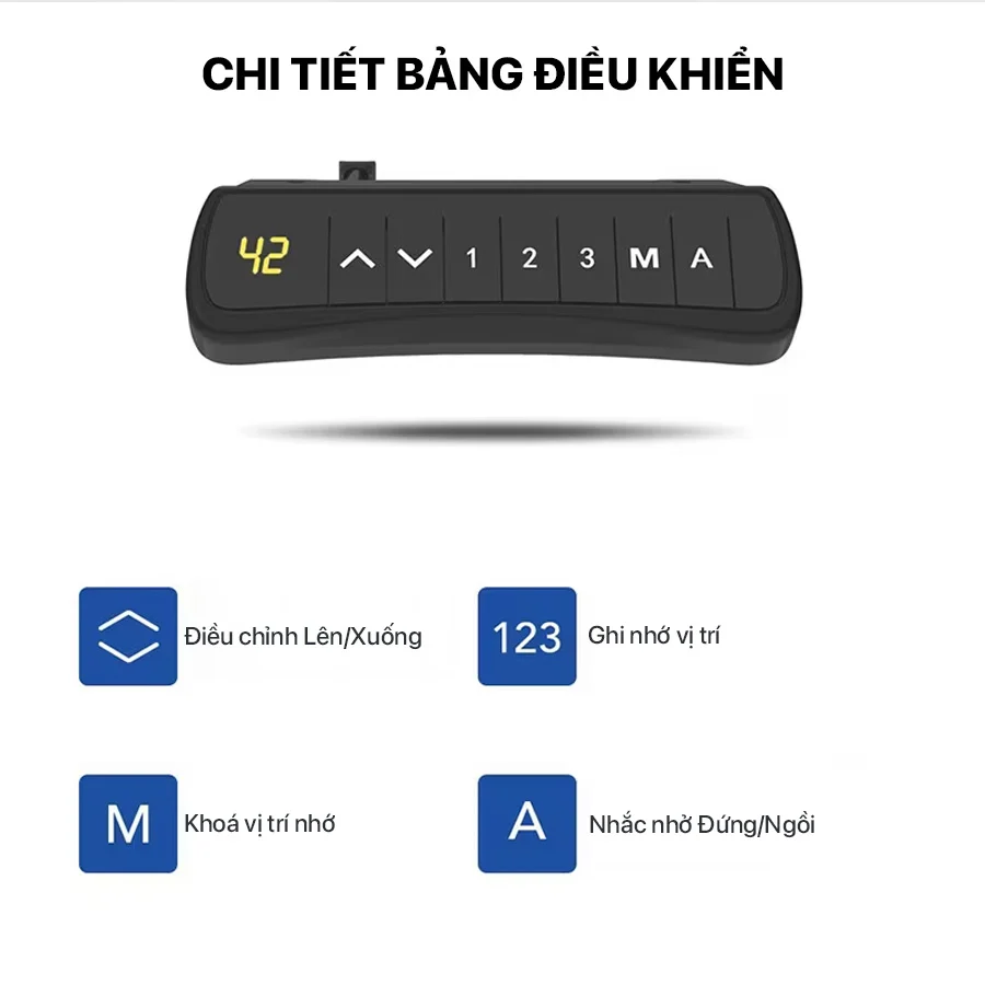 Bàn Phím Điều Khiển Điện Tử Thông Minh Đa Năng: Bàn được trang bị bàn phím điện tử hiện đại với màn hình LED hiển thị độ cao rõ nét. Các tính năng thông minh bao gồm: 3 vị trí bộ nhớ để lưu các mức độ cao yêu thích, tính năng nhắc nhở thay đổi tư thế giúp duy trì thói quen công thái học lành mạnh.