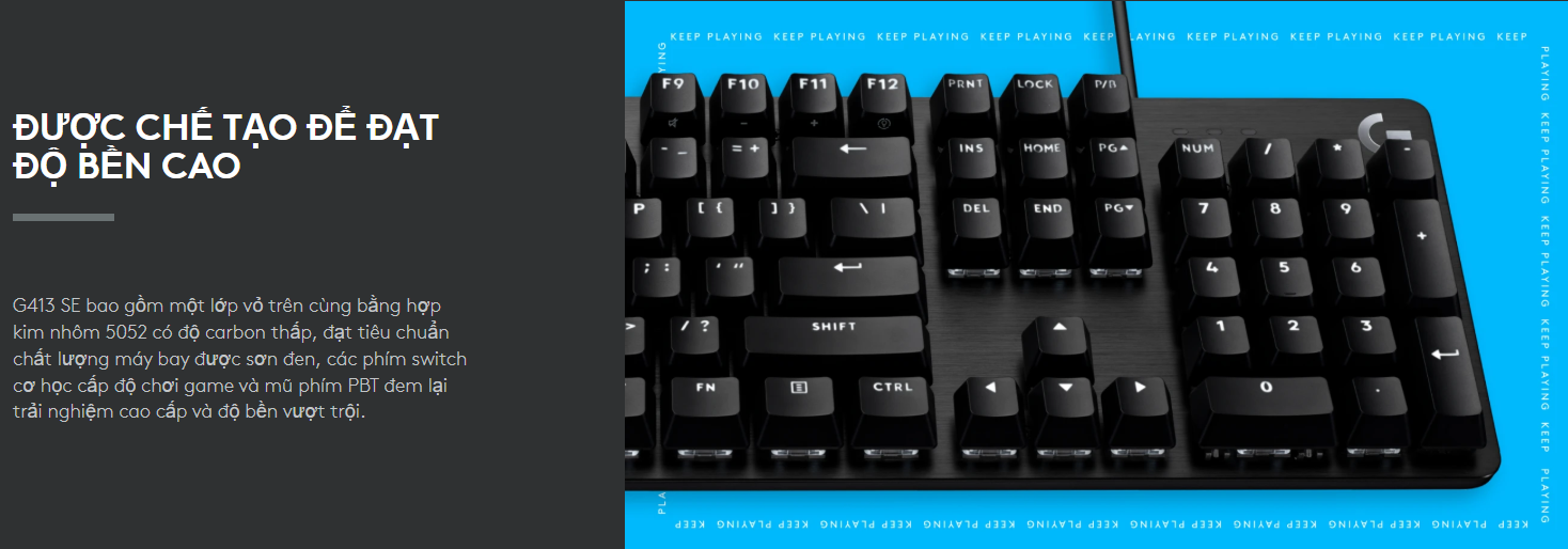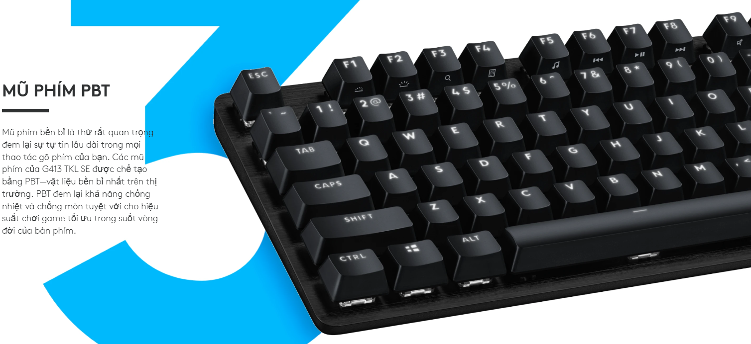Khác với các bàn phím thông thường sử dụng nhựa ABS, G413 SE được trang bị keycap bằng nhựa PBT. Đây là loại vật liệu bền nhất trên thị trường, có khả năng chống nhiệt và chống mài mòn tuyệt vời. Keycap PBT giúp mặt phím không bị bóng dầu hay mờ chữ sau một thời gian dài sử dụng cường độ cao.
