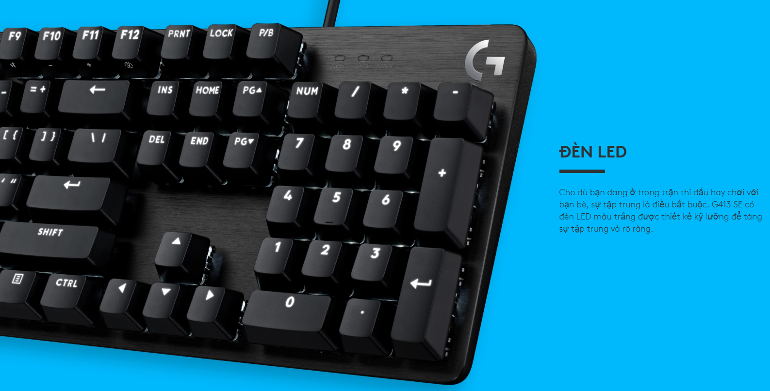 Thay vì hệ thống RGB đa sắc, G413 SE sử dụng đèn LED nền màu trắng thuần khiết. Ánh sáng này không chỉ giúp bạn định vị phím dễ dàng trong bóng tối mà còn tạo nên phong cách làm việc chuyên nghiệp, tập trung.