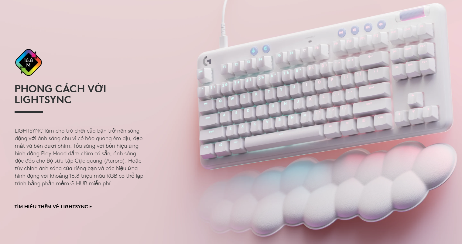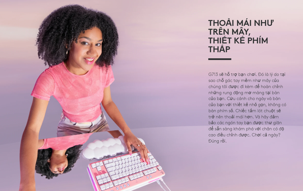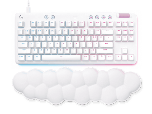 Mỗi chiếc G713 đều đi kèm với đệm kê tay hình đám mây độc quyền của Logitech. Được làm từ vật liệu mềm mại, nâng đỡ tốt và có vẻ ngoài cực kỳ đáng yêu, chiếc kê tay này không chỉ giúp bảo vệ cổ tay mà còn là phụ kiện trang trí "có một không hai" trên bàn làm việc của bạn.