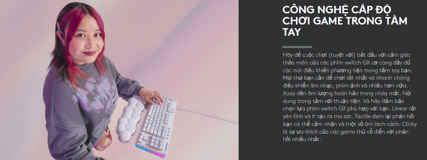 Dù có vẻ ngoài nhẹ nhàng, G713 vẫn là một "quái vật" hiệu năng với hệ thống switch cơ học GX. Bạn có thể lựa chọn các loại switch phù hợp với mình: