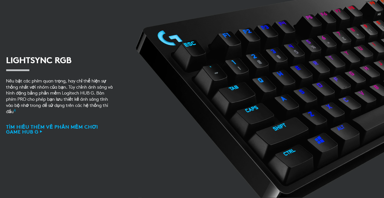 Hệ thống đèn nền 16,8 triệu màu không chỉ giúp bàn phím rực rỡ mà còn có thể lập trình để làm nổi bật các phím tắt quan trọng. Bạn có thể lưu trữ các cấu hình chiếu sáng tĩnh vào bộ nhớ tích hợp của bàn phím thông qua phần mềm G HUB để sử dụng tại các hệ thống máy tính thi đấu không được phép cài đặt phần mềm.