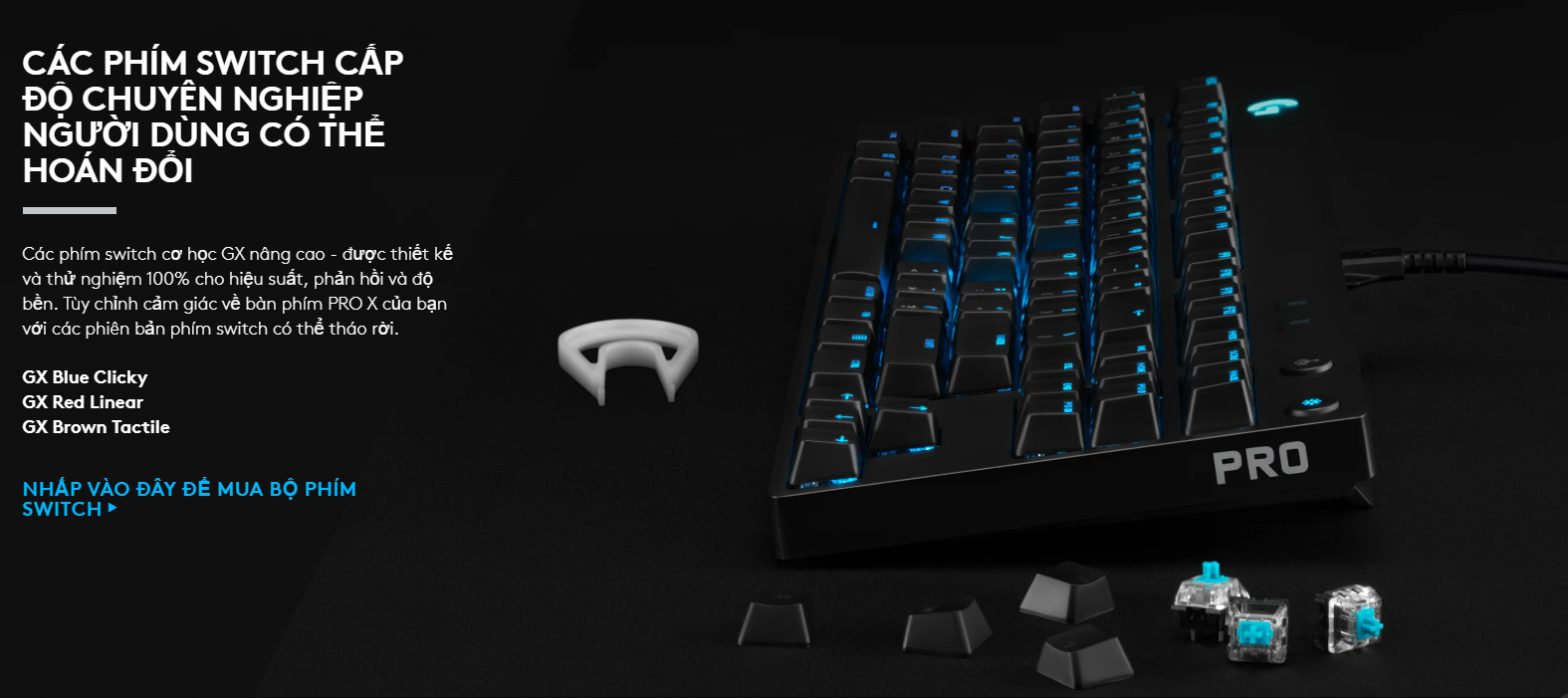 Đây là chiếc bàn phím đầu tiên của Logitech G cho phép bạn tự thay đổi switch mà không cần mối hàn. Bạn có thể lựa chọn giữa GX Blue (Clicky), GX Red (Linear) hoặc GX Brown (Tactile) để tùy chỉnh cảm giác nhấn cho từng vùng phím riêng biệt, phù hợp hoàn hảo với thói quen chơi game cá nhân.
