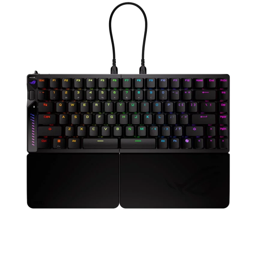 Thiết kế bàn phím tách rời 75% của ROG Falcata mang lại tính linh hoạt cao. Game thủ có thể sử dụng riêng biệt module bên trái, giải phóng không gian tối đa cho tay di chuột, hoặc điều chỉnh góc nghiêng tự nhiên, giảm căng thẳng cổ tay và vai. Hai đệm cổ tay silicone có thể tháo rời đi kèm giúp tăng cường sự thoải mái khi chơi game kéo dài.