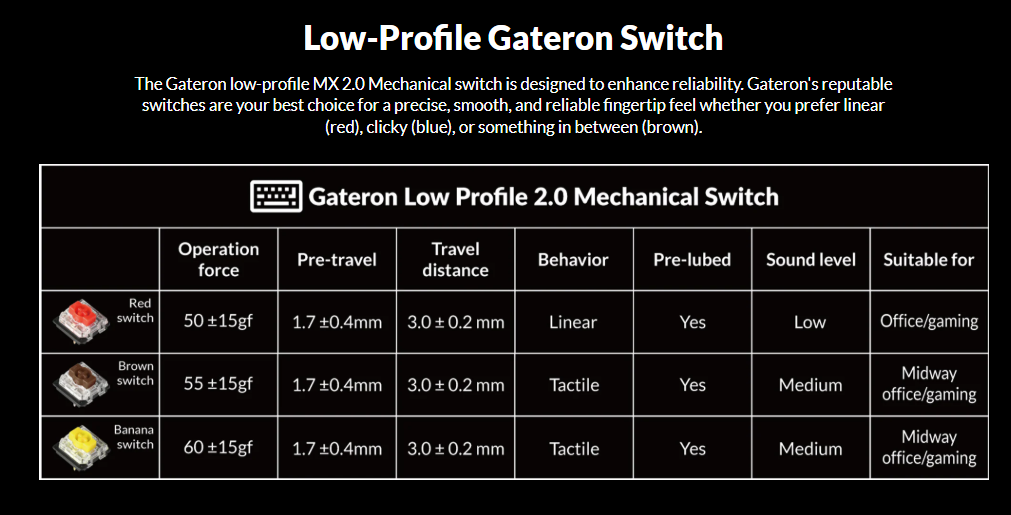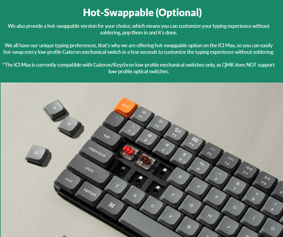 Switch: Low-Profile Gateron/Keychron Mechanical/Optical (Hotswap).