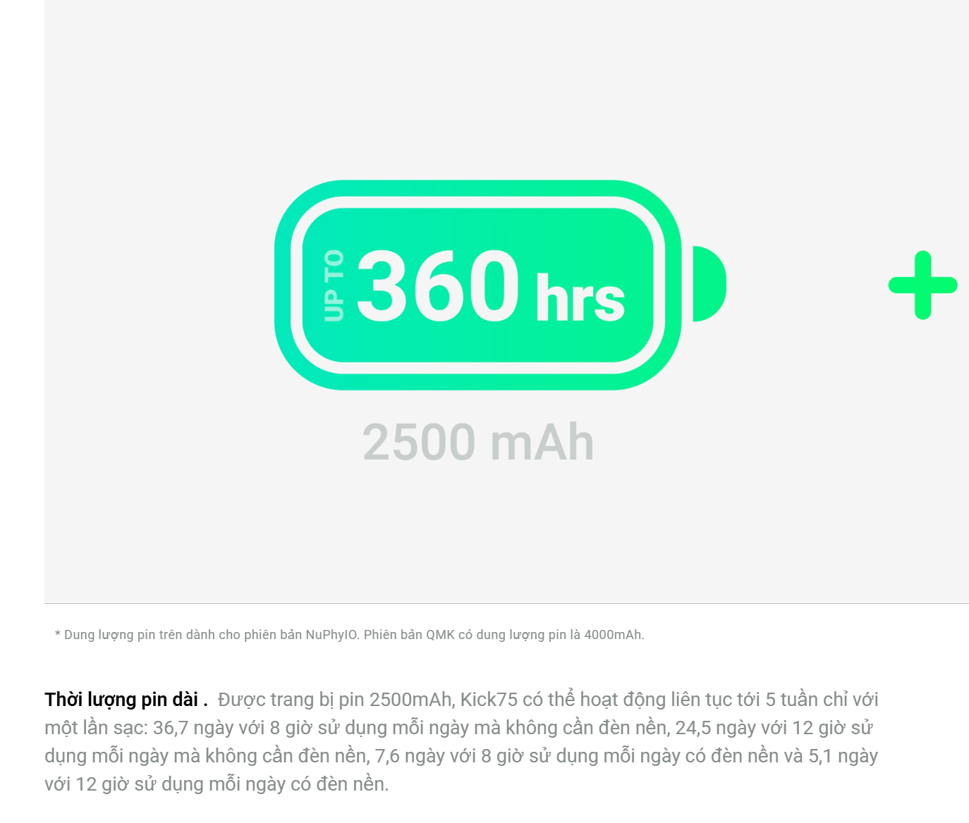 Pin: 2500mAh (Phiên bản NuPhyIO) cho thời gian làm việc (tắt đèn) lên đến 360 giờ.