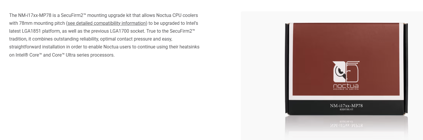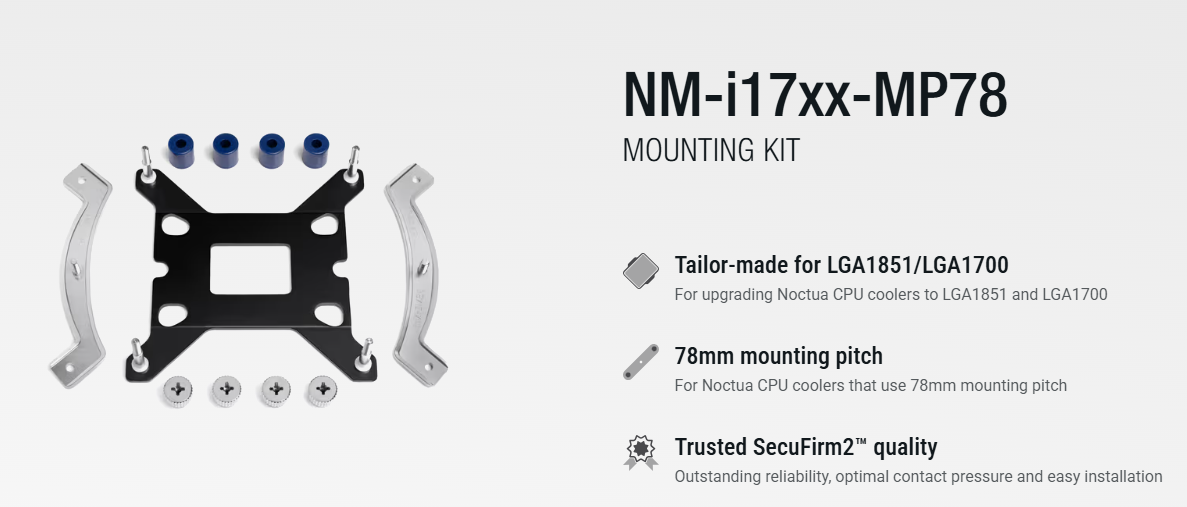 Ký hiệu MP78 có nghĩa là bộ ngàm này dành cho các tản nhiệt có khoảng cách giữa hai vít bắt cố định là 78mm. Đây là chuẩn phổ biến trên rất nhiều dòng tản nhiệt huyền thoại của Noctua (xem danh sách tương thích bên dưới).