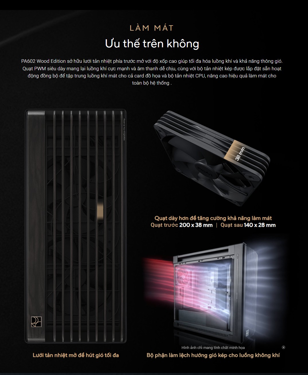 Vỏ case nổi bật với mặt trước ốp gỗ (Wood Edition) và tấm lưới tản nhiệt được thiết kế tinh xảo, mang lại vẻ ngoài thanh lịch, ấm áp, phù hợp với không gian làm việc chuyên nghiệp.