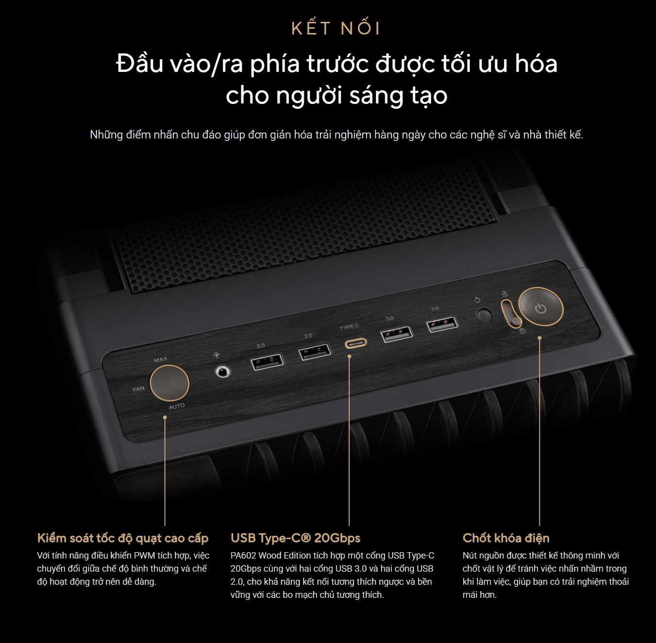 Vỏ Case ASUS ProArt PA602 Wood Edition Tempered Glass Panel là sự lựa chọn hoàn hảo, kết hợp giữa vẻ đẹp tinh tế, sang trọng và hiệu suất tản nhiệt vượt trội. Với khả năng hỗ trợ linh kiện khổng lồ và các tính năng tiện lợi, đây là nền tảng lý tưởng để bạn kiến tạo một cỗ máy làm việc chuyên nghiệp, hoạt động mát mẻ, ổn định và đầy phong cách.