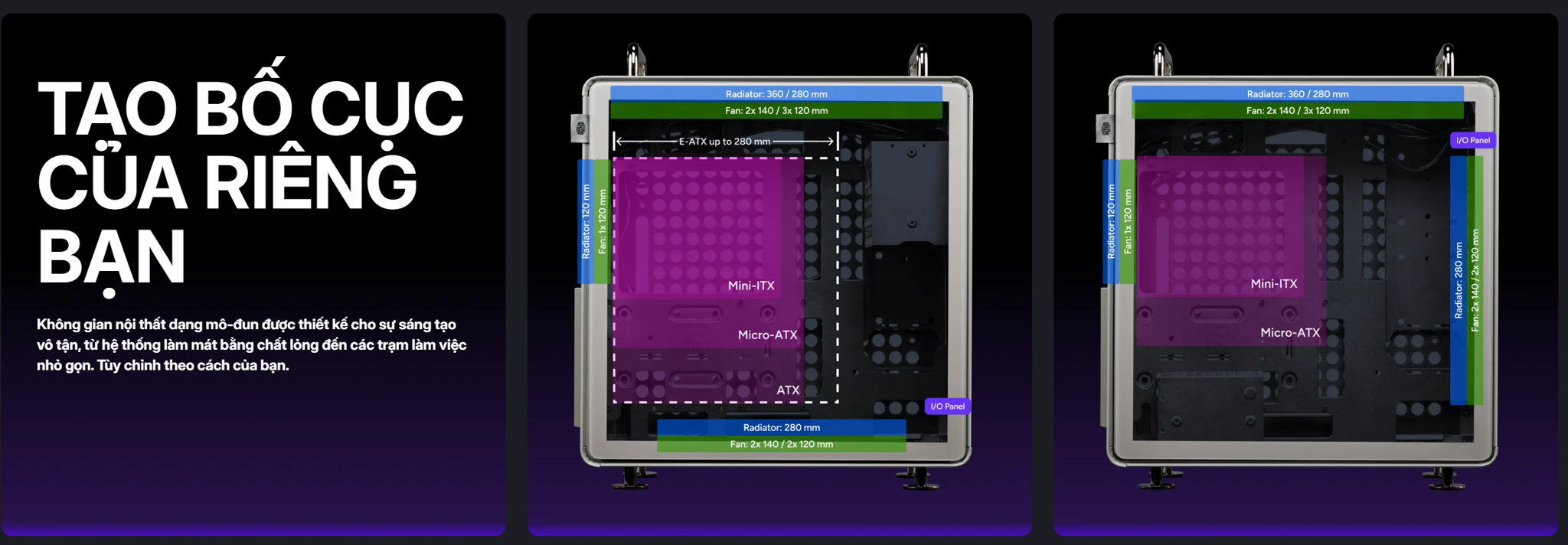 Dù có vẻ ngoài gọn gàng, QUBE 540 sở hữu không gian nội thất cực kỳ linh hoạt. Case hỗ trợ các dòng mainboard từ ITX cho đến E-ATX, card đồ họa dài tới 365mm và tản nhiệt CPU cao 172mm. Đặc biệt, bạn có thể lắp đặt bộ nguồn ATX ở nhiều vị trí khác nhau tùy thuộc vào kích thước mainboard, giúp tối ưu hóa luồng khí và tính thẩm mỹ.