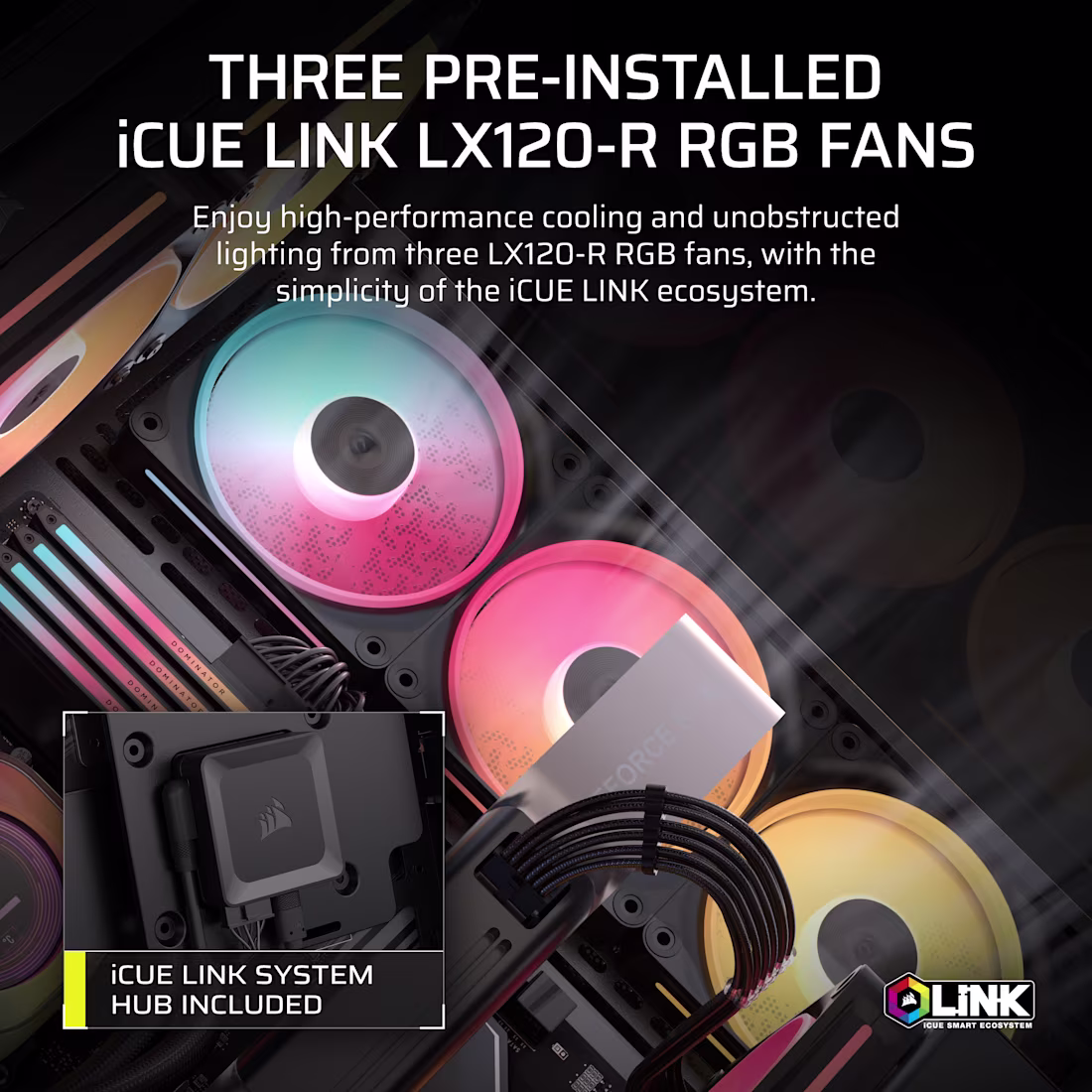 - Quạt Kèm Theo: 3x iCUE LINK LX120-R RGB và System Hub