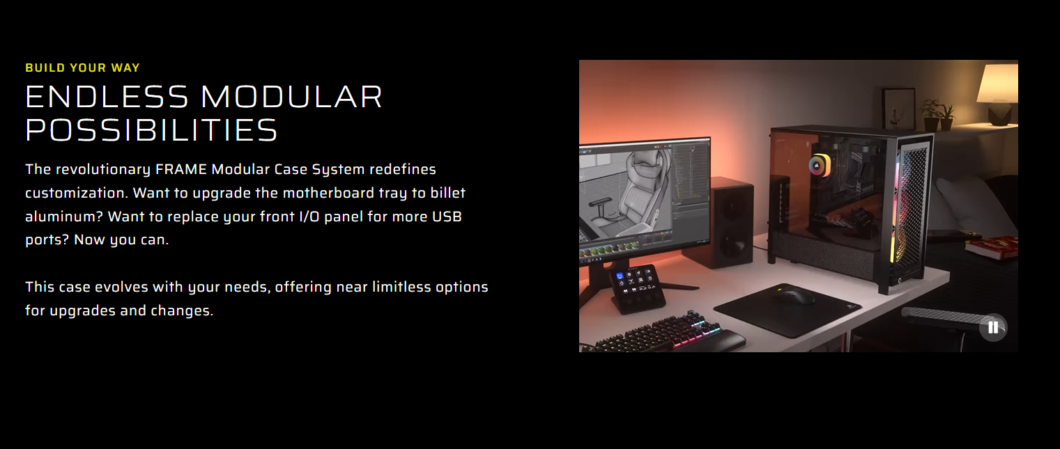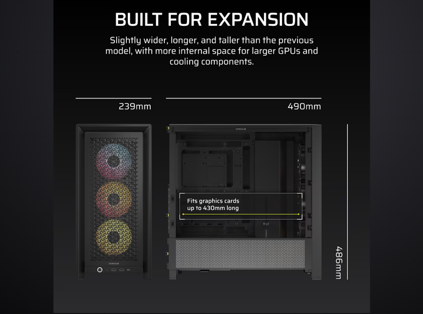 Corsair FRAME 4000D RS ARGB Mid-Tower là case gaming cao cấp, tối ưu airflow, hỗ trợ GPU lớn, CPU cooler cao, và ARGB modular linh hoạt cho build PC cá nhân hóa.