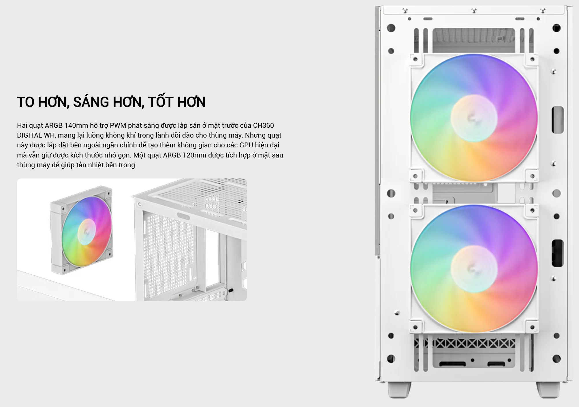 Hiệu suất làm mát ấn tượng: Mặc dù có kích thước nhỏ gọn, CH360 DIGITAL vẫn hỗ trợ lắp đặt tản nhiệt nước AIO kích thước lên đến 360mm ở mặt trước. Sản phẩm đi kèm sẵn hai quạt ARGB 140mm ở phía trước và một quạt ARGB 120mm ở phía sau, đảm bảo luồng không khí dồi dào và hiệu quả làm mát tối ưu ngay từ khi xuất xưởng.