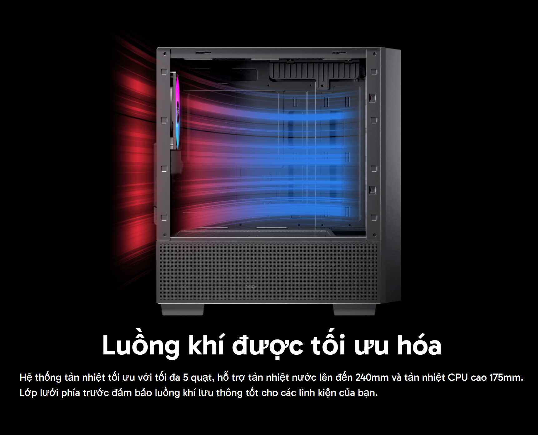 Tản nhiệt hiệu quả: Pulse PM150 được thiết kế để tối ưu luồng không khí. Case hỗ trợ lắp đặt tổng cộng 5 quạt 120mm hoặc 4 quạt 140mm ở mặt trước, trên và sau, đảm bảo luồng không khí lưu thông tốt, giữ cho các linh kiện luôn mát mẻ. Ngoài ra, case còn hỗ trợ lắp đặt tản nhiệt nước AIO 240mm ở cả mặt trước và trên, lý tưởng cho những người dùng muốn tối ưu hiệu suất tản nhiệt.