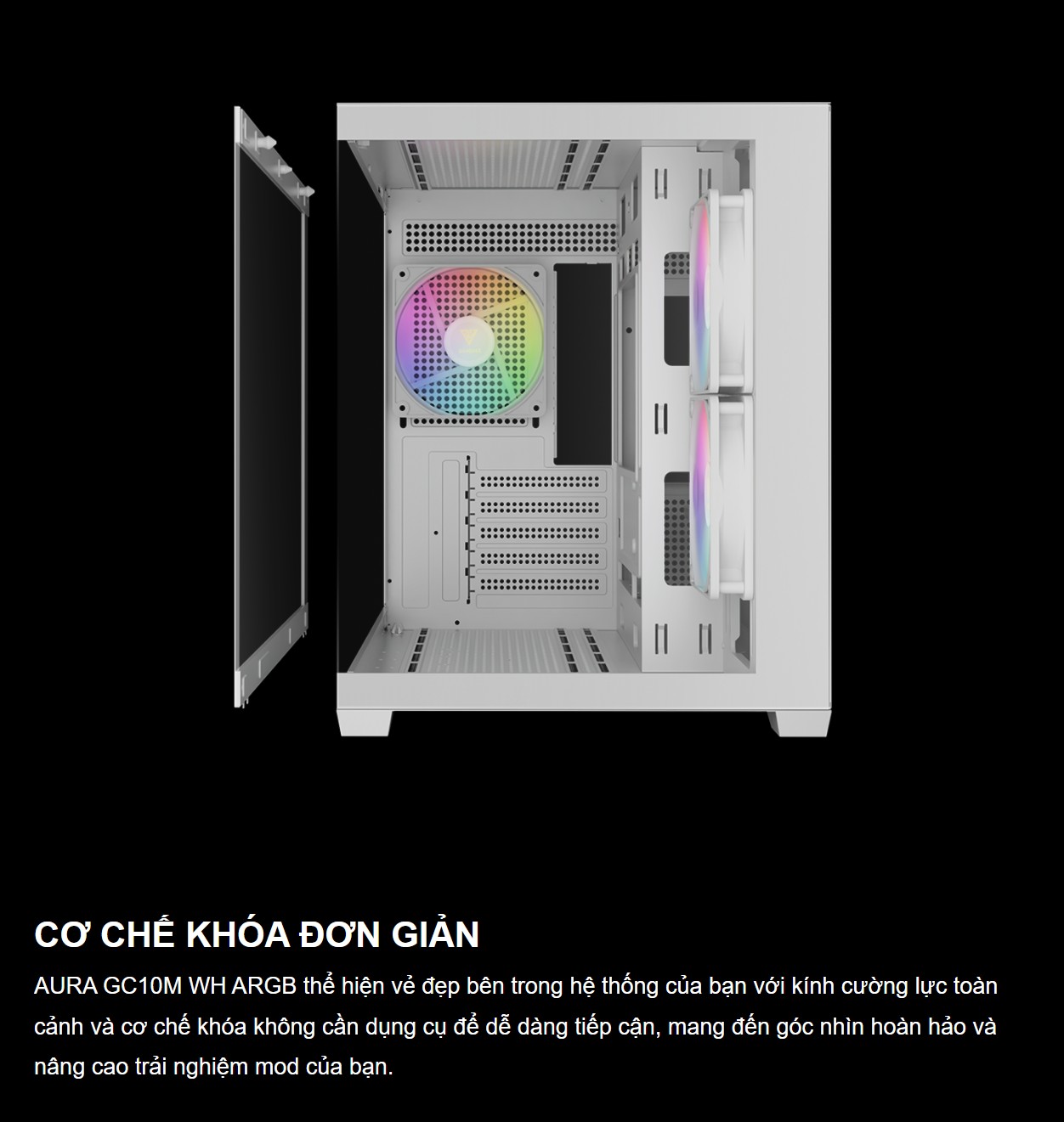 Vỏ case được trang bị sẵn 3 quạt ARGB 120mm giúp tối ưu luồng không khí ngay từ khi xuất xưởng. Không chỉ vậy, AURA GC10M V2 còn hỗ trợ lắp đặt radiator tản nhiệt nước lên đến 360mm ở mặt trên và nhiều vị trí lắp quạt khác, mang lại khả năng làm mát vượt trội cho cả những hệ thống cấu hình cao, đảm bảo hiệu năng luôn ổn định.