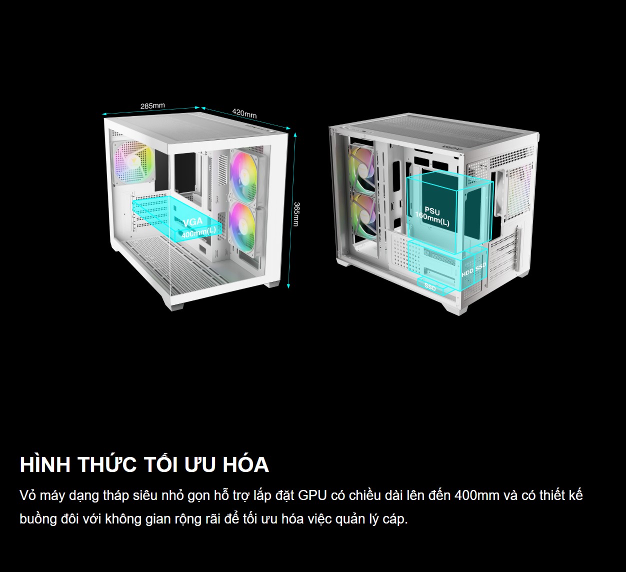 Dù có kích thước Micro-Tower nhỏ gọn, case vẫn hỗ trợ lắp đặt card đồ họa dài tới 400mm và tản nhiệt khí CPU cao 165mm. Đặc biệt, case còn tương thích với các dòng bo mạch chủ giấu dây nối (connector-hidden motherboards), giúp việc đi dây trở nên gọn gàng và chuyên nghiệp hơn bao giờ hết.