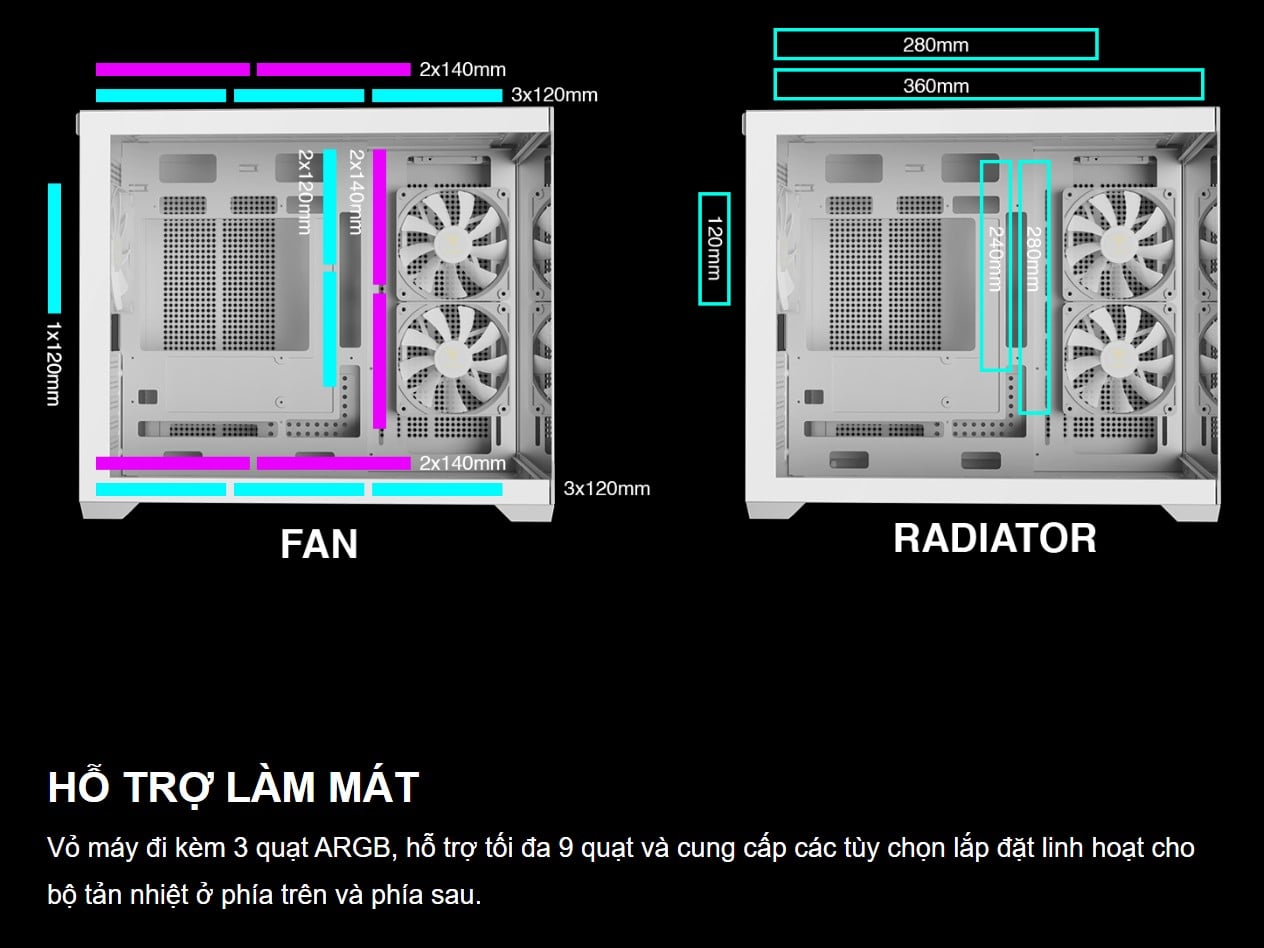 - Hỗ trợ Radiator: Trên: 360/280mm, Hông: 240mm, Sau: 120mm