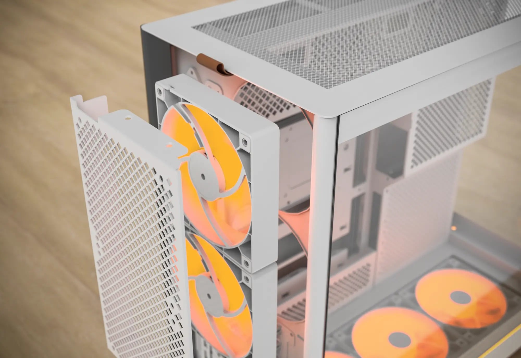Montech cực kỳ hào phóng khi lắp đặt sẵn 5 quạt 120mm (3 quạt dưới đáy thổi trực tiếp vào GPU và 2 quạt phía sau để thoát khí nóng). Case hỗ trợ tối đa 8 quạt và két nước tản nhiệt lên đến 360mm ở mặt trên, đảm bảo luồng không khí luôn được lưu thông mạnh mẽ giúp hệ thống luôn mát mẻ.