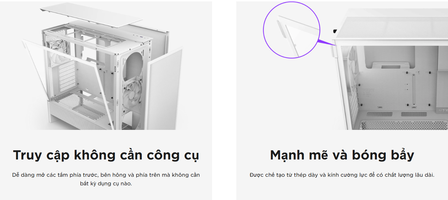 Quản lý cáp dễ dàng: NZXT H5 Flow RGB được thiết kế để việc lắp ráp trở nên đơn giản và gọn gàng. Case có các kênh quản lý cáp rộng rãi, kèm theo các móc và dây buộc cáp, giúp bạn dễ dàng đi dây sạch sẽ. Điều này không chỉ tăng tính thẩm mỹ mà còn cải thiện luồng không khí bên trong case.