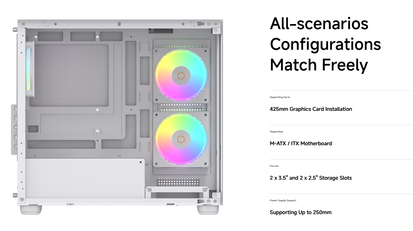 Với khả năng hỗ trợ card đồ họa dài tới 425mm, tản nhiệt CPU cao 170mm và nguồn dài 250mm, Gamma C52 ARGB đảm bảo không gian lắp đặt linh hoạt cho cả game thủ và người dùng phổ thông.