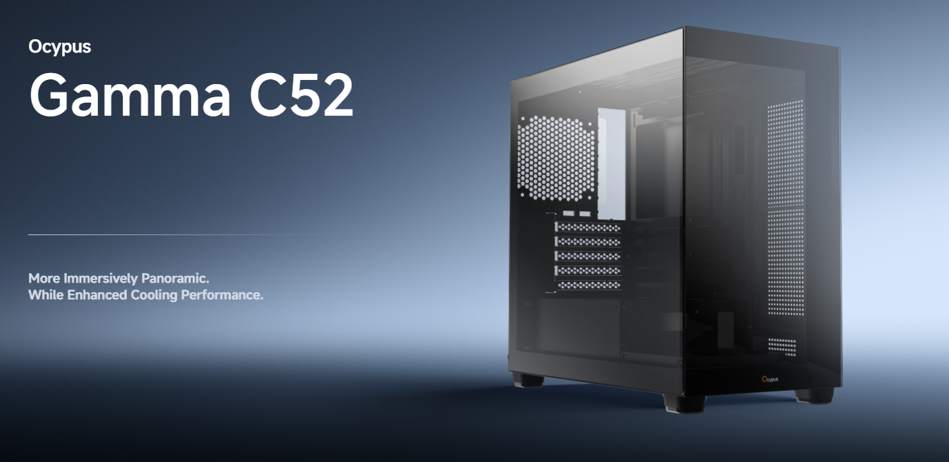 Ocypus Gamma C52 mang phong cách tối giản, cứng cáp và tinh tế, được trang bị kính cường lực ở mặt trước và bên trái, giúp người dùng dễ dàng trưng bày linh kiện và tạo điểm nhấn cho góc máy tính.