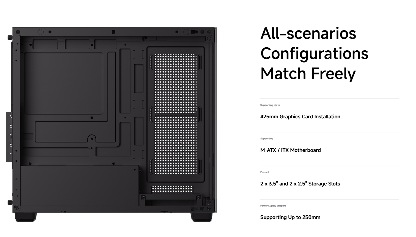 Dù có kích thước nhỏ gọn, Gamma C52 vẫn hỗ trợ card đồ họa dài tới 425mm, tản nhiệt CPU cao 170mm và nguồn dài 250mm, đáp ứng tốt cho các cấu hình chơi game hoặc làm việc chuyên nghiệp.