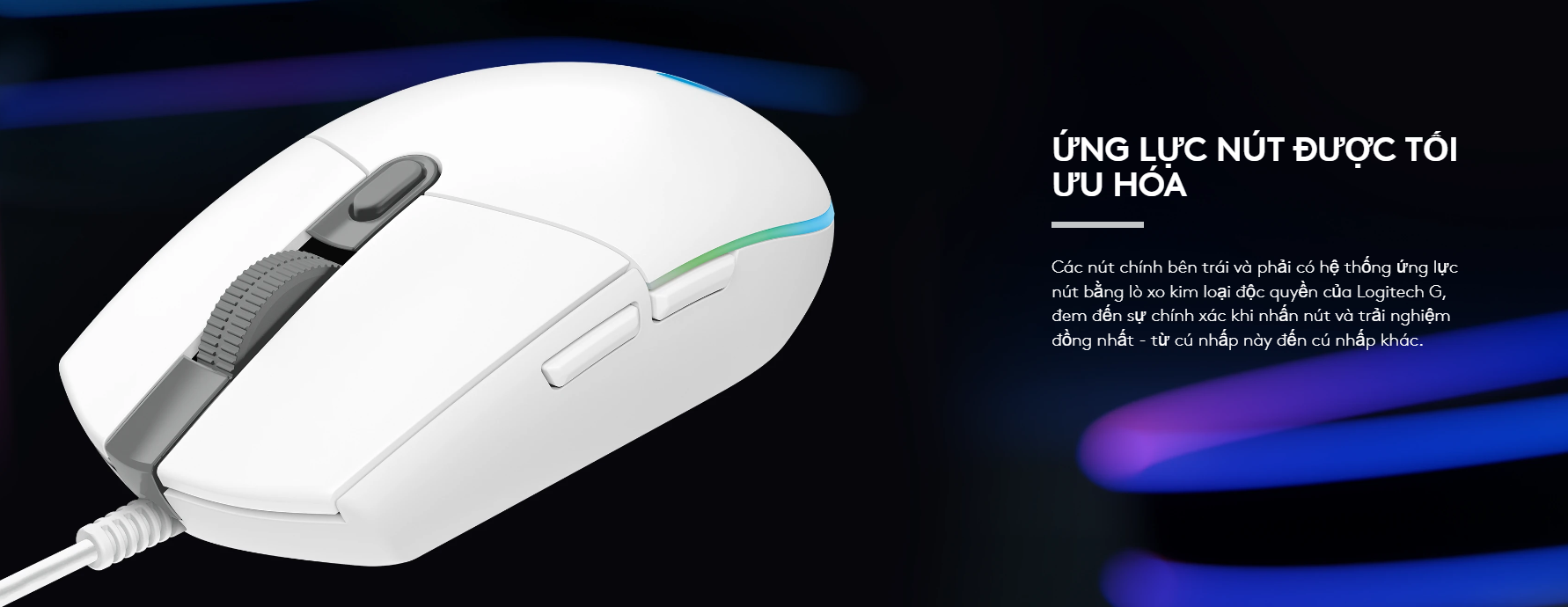 Phím bấm trái và phải của Chuột có dây Logitech G102 Gaming Gen 2 được trang bị hệ thống ứng lực lò xo kim loại độc quyền của Logitech G. Công nghệ này giúp giảm lực nhấn cần thiết, mang lại cảm giác click chuột giòn giã, chính xác và độ phản hồi đồng nhất trong suốt thời gian dài sử dụng.