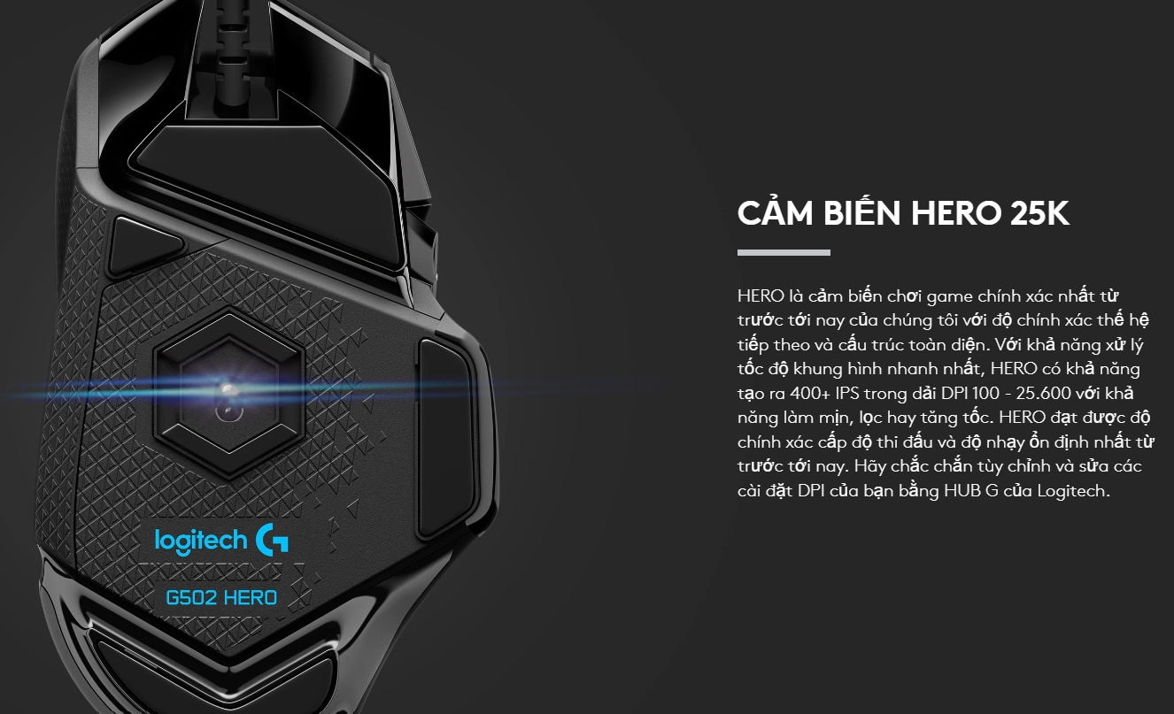 Trái tim của Logitech G502 HERO là cảm biến quang học tiên tiến nhất hiện nay, cho phép theo dõi ở cấp độ dưới micromet. Với dải DPI từ 100 đến 25.600, cảm biến này mang lại khả năng phản hồi chính xác 1:1, không có hiện tượng tăng tốc hay làm mịn, giúp mọi cú vẩy chuột của bạn đạt độ ổn định tuyệt đối.