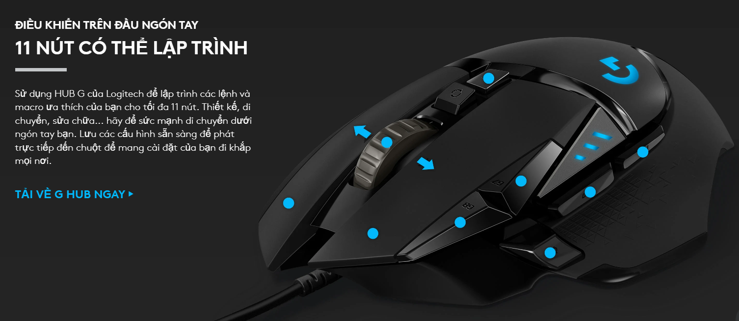 Đây là tính năng độc quyền và cực kỳ được yêu thích trên dòng G502. Bạn có thể chuyển đổi linh hoạt giữa chế độ cuộn từng nấc (Click-to-click) để chọn vũ khí chính xác và chế độ cuộn nhanh vô tận (Hyper-fast) để lướt qua các trang web dài hoặc tài liệu chỉ trong nháy mắt.