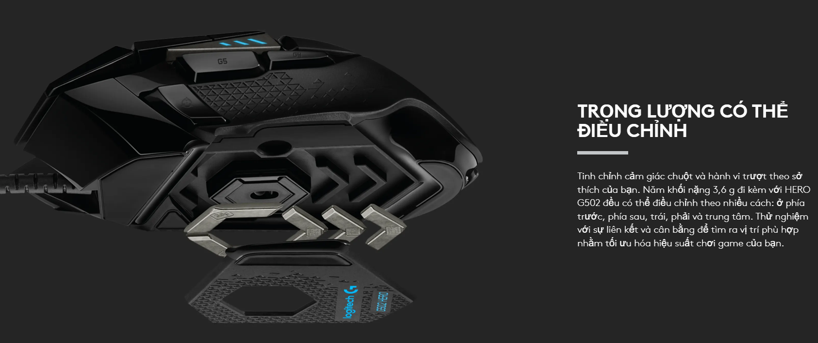 Logitech G502 HERO đi kèm với 5 viên tạ 3,6g có thể tháo rời. Bạn có thể bố trí các viên tạ này ở mặt dưới của chuột để thay đổi trọng tâm và trọng lượng tổng thể, tạo ra cảm giác cầm nắm vừa vặn và đầm tay nhất theo phong cách chơi cá nhân.