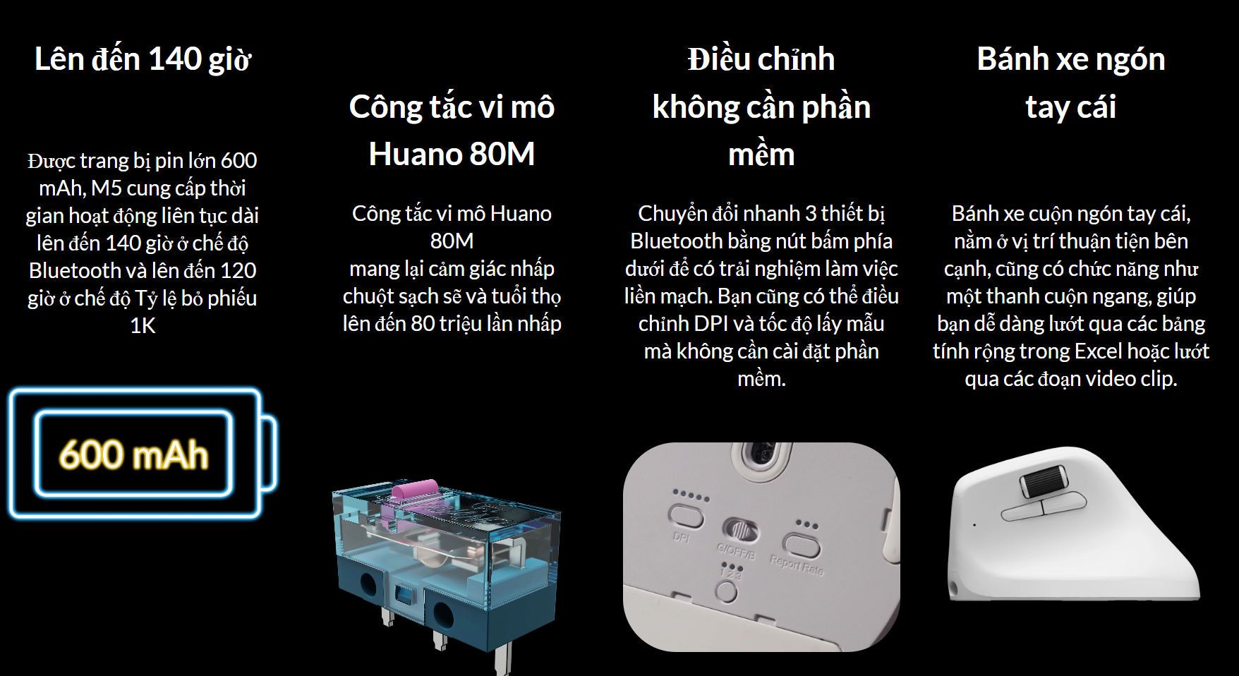 Keychron M5 có trọng lượng nhẹ chỉ 95g (± 3g), giảm mỏi cổ tay khi sử dụng lâu dài. Thiết kế Ergonomic phù hợp với form tay, mang lại sự thoải mái tối đa. Switch Huano Micro Switch có tuổi thọ lên đến 80 Triệu lần click, đảm bảo độ bền bỉ và độ tin cậy cực cao.