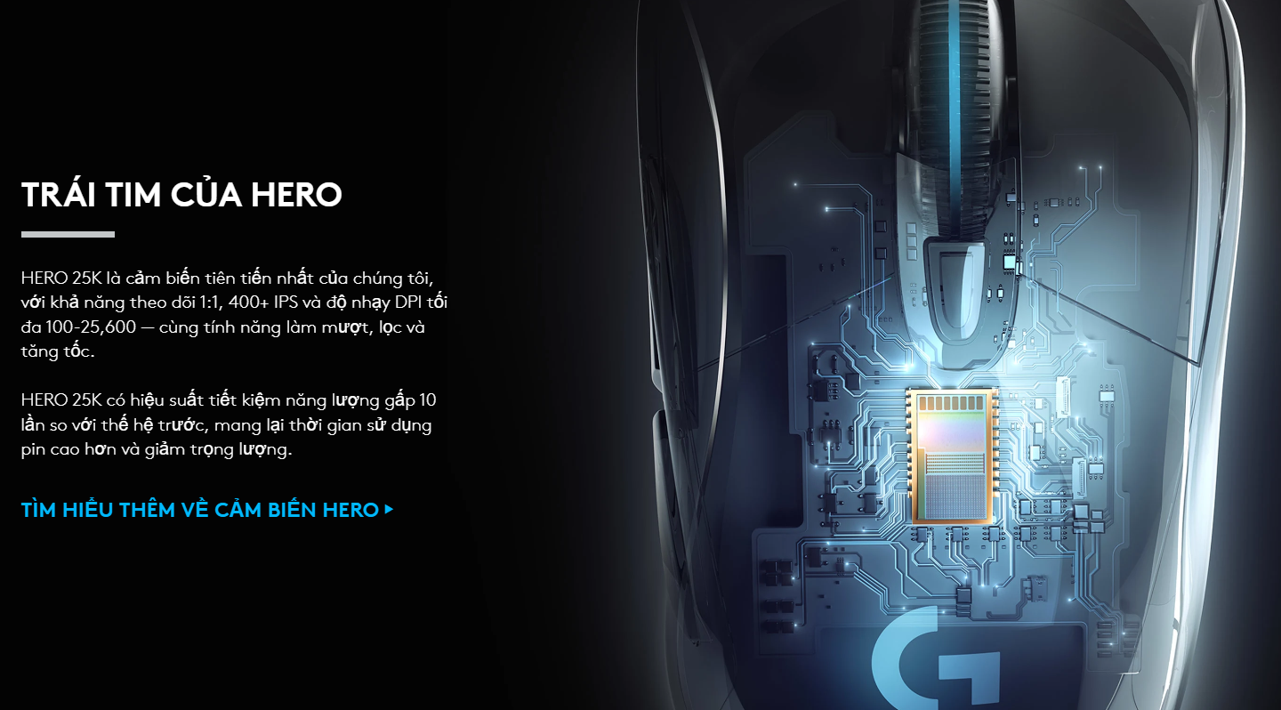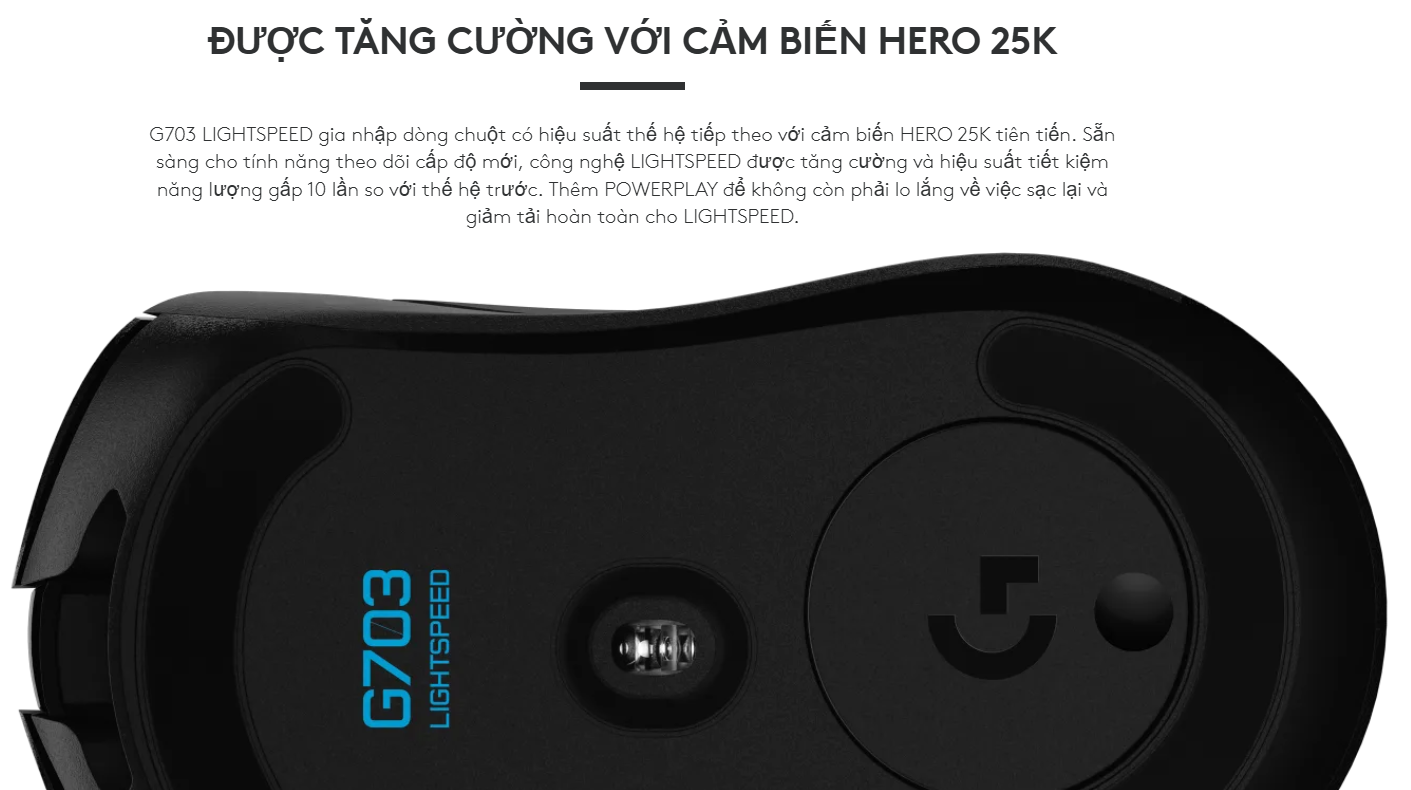 Trái tim của G703 là cảm biến HERO 25K, mang lại khả năng theo dõi 1:1 và độ nhạy lên đến 25.600 DPI. Đây là cảm biến hiệu suất cao nhất của Logitech G, giúp loại bỏ hoàn toàn hiện tượng làm mịn, lọc hay tăng tốc, đảm bảo mọi cử động tay của bạn đều được tái hiện chính xác nhất trong trò chơi.