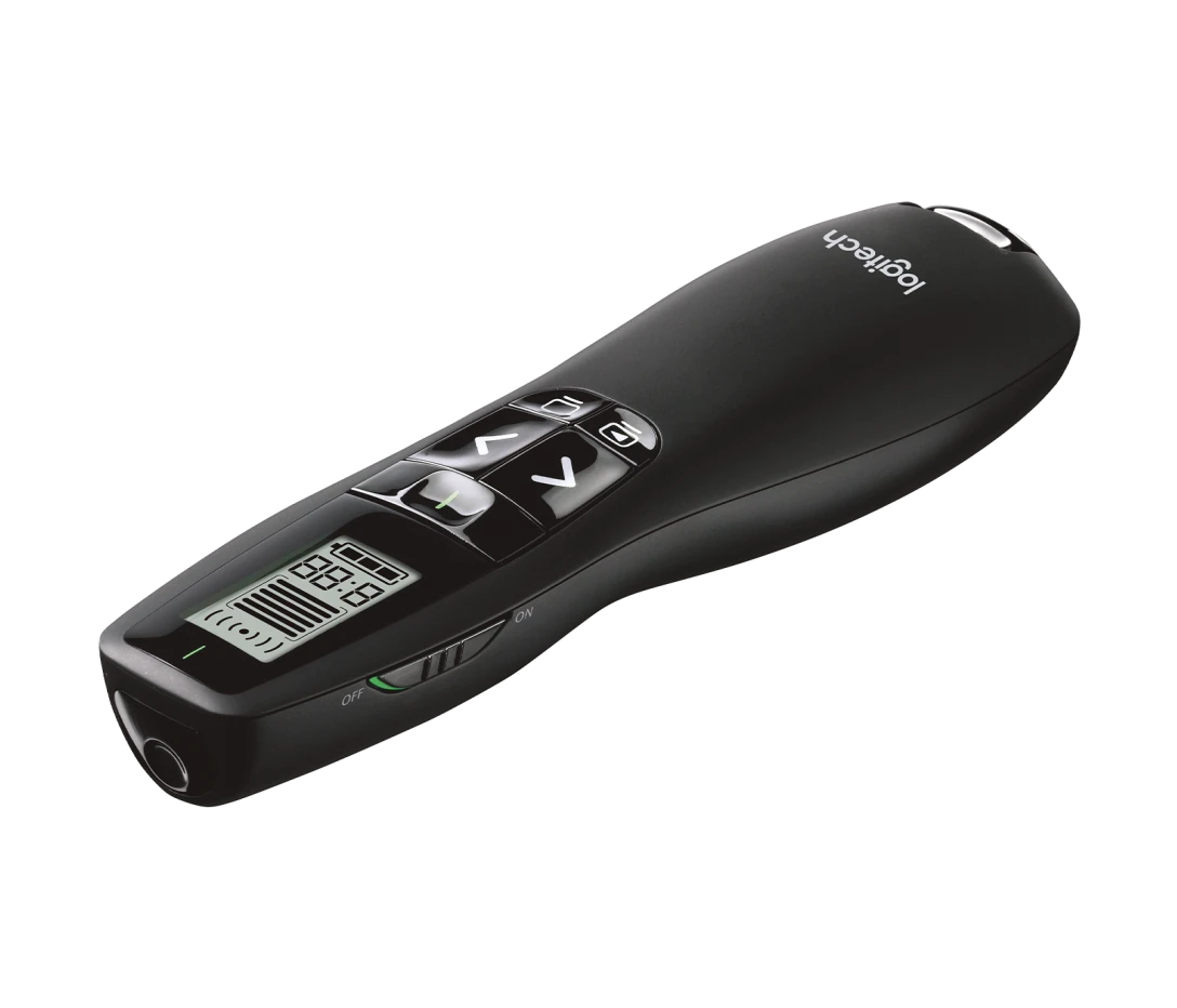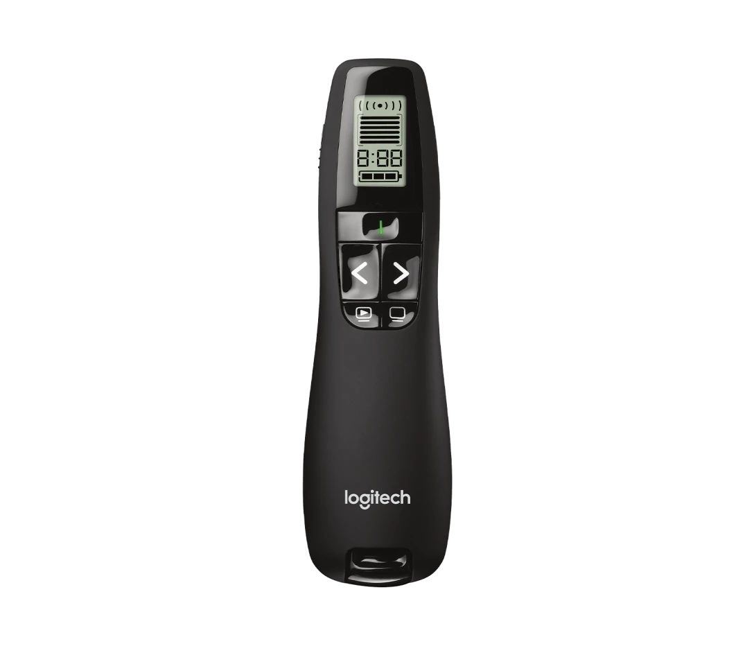 Điều khiển trình chiếu từ xa Logitech R800 Laser Presentation Remote là công cụ chuyên nghiệp được thiết kế tối ưu cho các buổi thuyết trình và hội thảo lớn. Điểm nhấn vượt trội của R800 là tia laser xanh sáng rõ hơn gấp nhiều lần so với laser đỏ truyền thống, đảm bảo nội dung trình bày của bạn luôn được làm nổi bật hiệu quả ngay cả trên màn hình plasma, LCD hay trong phòng sáng. Ngoài ra, Logitech R800 còn tích hợp màn hình LCD hiển thị thời gian và cảnh báo rung linh hoạt, giúp bạn quản lý thời gian thuyết trình một cách dễ dàng và chuyên nghiệp.