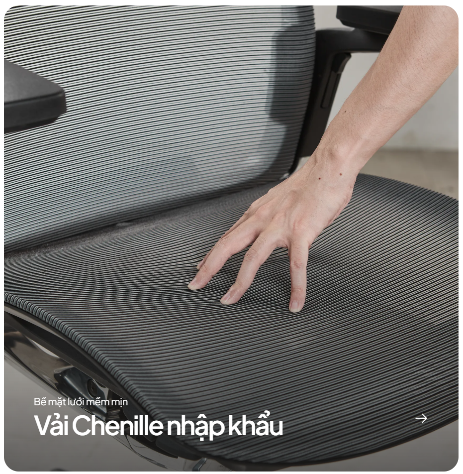 - Chất liệu cao cấp, cảm giác êm ái: Ghế sử dụng lưới mềm mịn và êm ái được nhập khẩu từ Italia, mang lại cảm giác ngồi thoải mái, thoáng khí và sang trọng. Chất liệu này giúp bạn không bị bí bách, đổ mồ hôi khi ngồi làm việc trong thời gian dài.