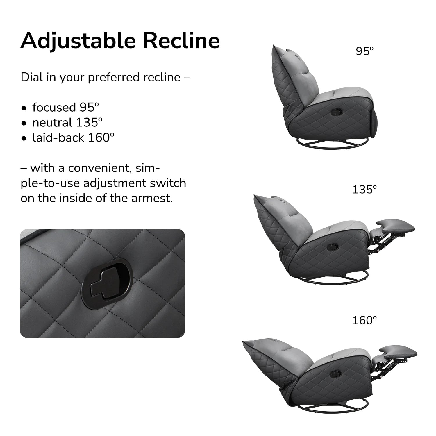 - Tính năng: Xoay (Swivel), Ngả lưng (Recline), Bập bênh (Rock)