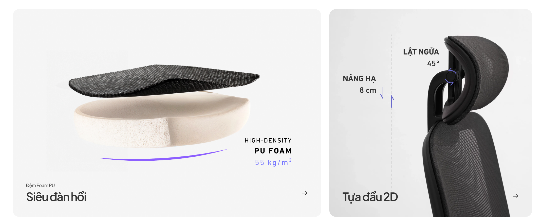 - Chất liệu cao cấp, tạo cảm giác thoải mái: Phần mâm ngồi của ghế sử dụng đệm PU Foam mật độ cao 55kg/m³ siêu đàn hồi, mang lại cảm giác ngồi êm ái, không bị xẹp lún sau thời gian dài sử dụng. Phần lưng và tựa đầu được làm từ 100% lưới Aero Mesh thoáng khí, giúp bạn luôn cảm thấy mát mẻ, đặc biệt trong những ngày hè nóng bức. Vải bọc Draw Texturised Yarn mềm mại, chống nhăn, co rút và phai màu, đảm bảo ghế luôn bền đẹp.