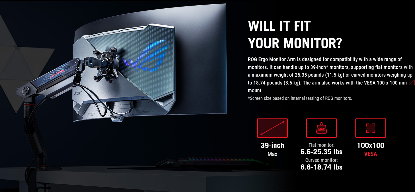 Giá đỡ màn hình ROG Ergo AAS01 được chế tạo để xử lý các màn hình gaming lớn, bao gồm cả màn hình cong siêu rộng. Tay đỡ có thể chịu tải trọng tối đa lên đến 8.5kg (18.7 lbs) và tương thích với màn hình kích thước từ 17 inch đến 49 inch. Điều này đảm bảo tính ổn định và an toàn tuyệt đối cho các mẫu màn hình cao cấp và nặng.