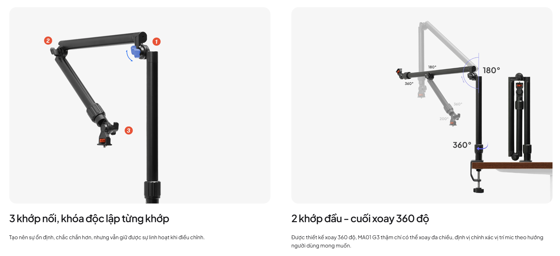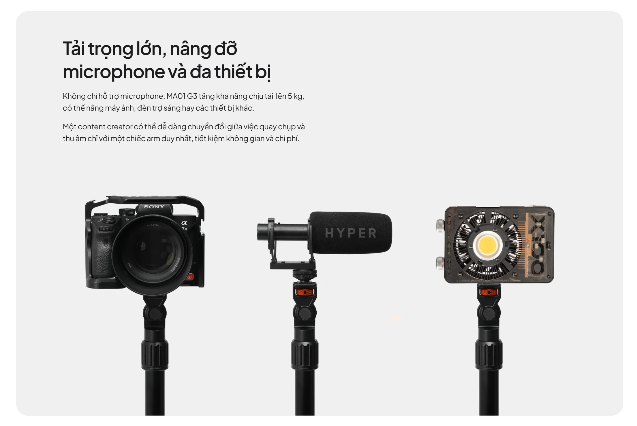 - Tải trọng vượt trội, hỗ trợ đa thiết bị: Với khả năng chịu tải lên tới 5 kg, MA01 G3 vượt xa các sản phẩm cùng phân khúc. Điều này cho phép bạn không chỉ gắn micro mà còn có thể luân phiên sử dụng với máy ảnh, đèn studio hoặc các thiết bị khác, mang lại sự linh hoạt tối đa cho không gian setup của bạn.