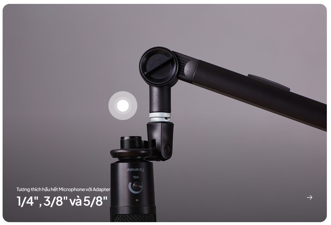 - Tương thích đa dạng: Giá đỡ có thể chịu tải trọng tối đa 1.2 kg và đi kèm adapter hỗ trợ 1/4", 3/8" và 5/8", tương thích với hầu hết các loại microphone, shock mount và pop filter phổ biến trên thị trường.