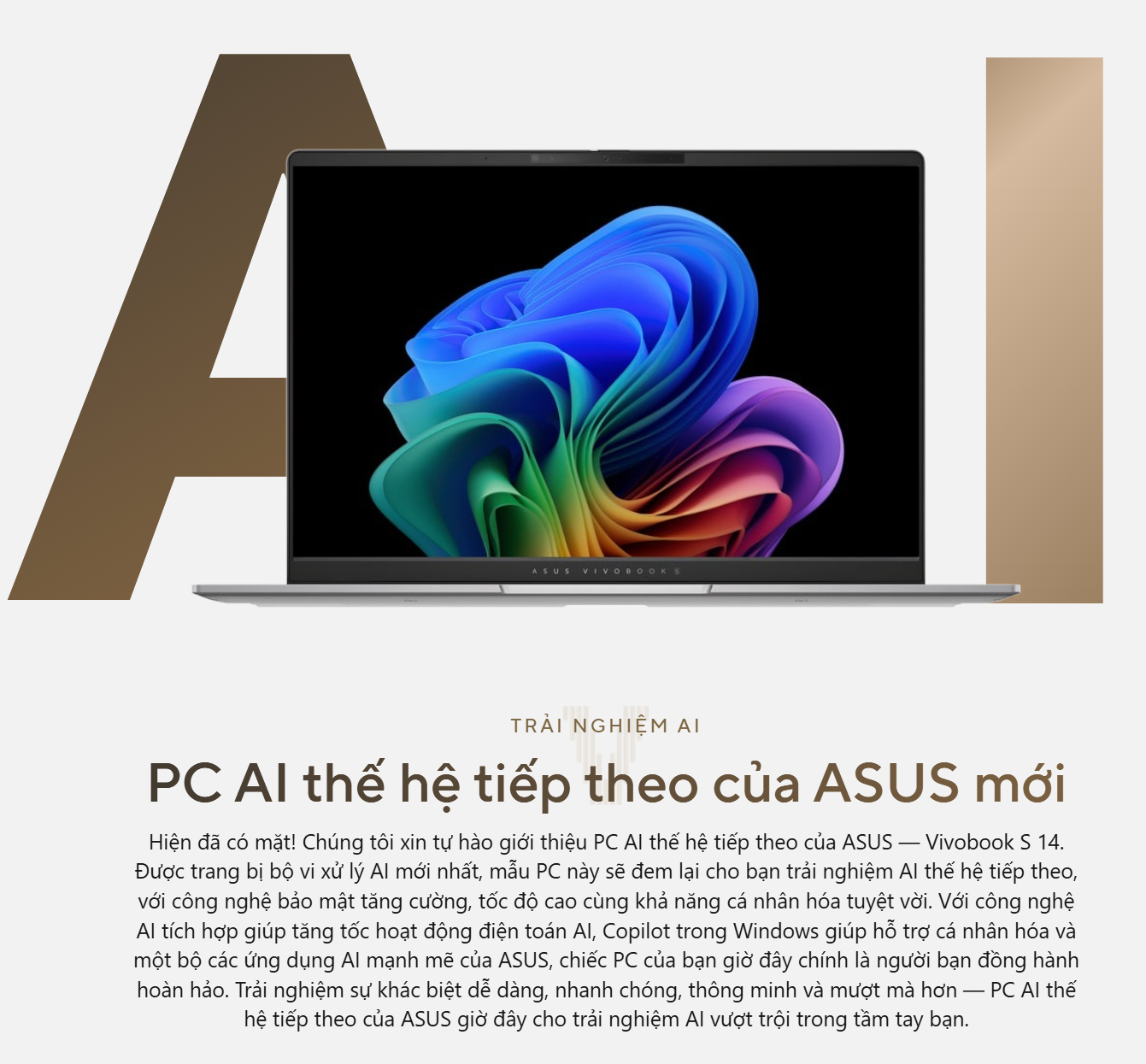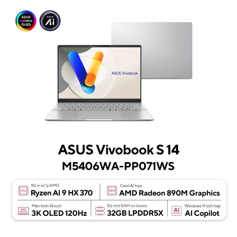 ASUS Vivobook S 14 M5406WA-PP071WS là một sự lựa chọn thông minh cho những ai đang tìm kiếm một chiếc laptop kết hợp giữa hiệu năng mạnh mẽ, tính di động cao và thiết kế hiện đại. Với bộ xử lý AMD Ryzen AI 9 cùng các tính năng AI, sản phẩm này sẽ là trợ thủ đắc lực giúp bạn hoàn thành mọi công việc một cách hiệu quả.