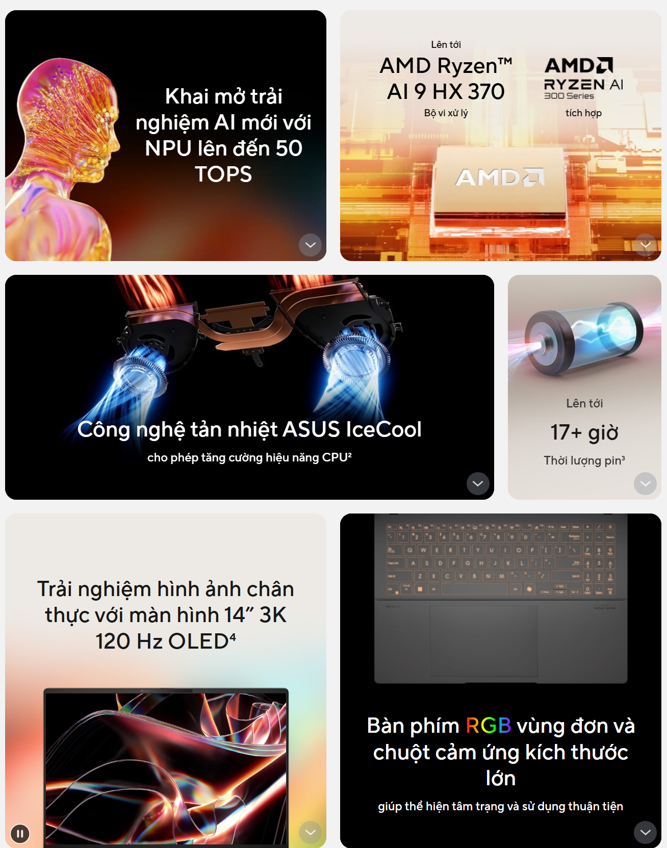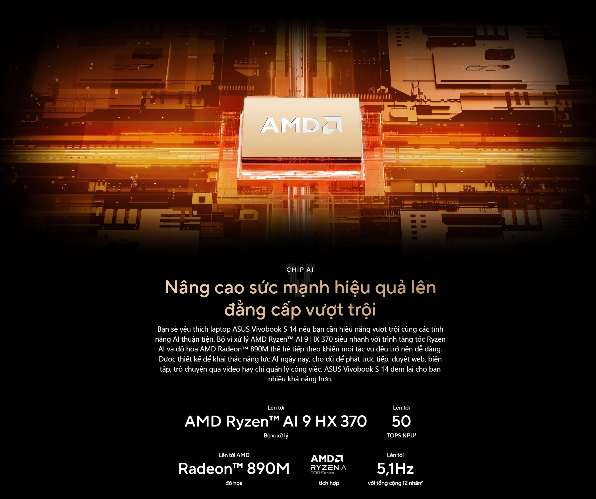 - Sức mạnh AI từ chip AMD Ryzen AI 9 HX 370: Được trang bị bộ xử lý AMD Ryzen AI 9 HX 370, chiếc laptop này mang đến hiệu năng AI vượt trội, giúp tối ưu hóa các tác vụ học tập và làm việc. Với 32GB RAM LPDDR5X và 1TB SSD, bạn có thể xử lý đa tác vụ, duyệt web và làm việc trên các ứng dụng văn phòng mượt mà, không gặp bất kỳ trở ngại nào.