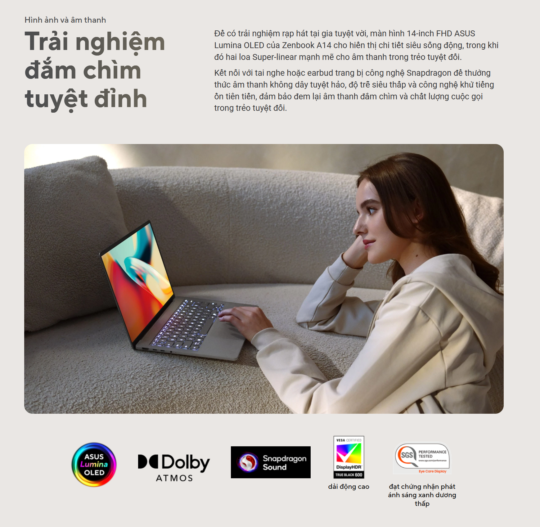 - Màn hình OLED 2K chất lượng cao: Màn hình OLED 14 inch với độ phân giải 2K (1920 x 1200) mang lại trải nghiệm hình ảnh tuyệt vời. Với độ phủ màu 100% DCI-P3, độ sáng 400 nits và chuẩn VESA DisplayHDR True Black 600, màn hình này tái tạo màu sắc chính xác và độ tương phản sâu. Công nghệ giảm ánh sáng xanh được chứng nhận bởi TÜV Rheinland và SGS giúp bảo vệ mắt bạn khi làm việc trong thời gian dài.