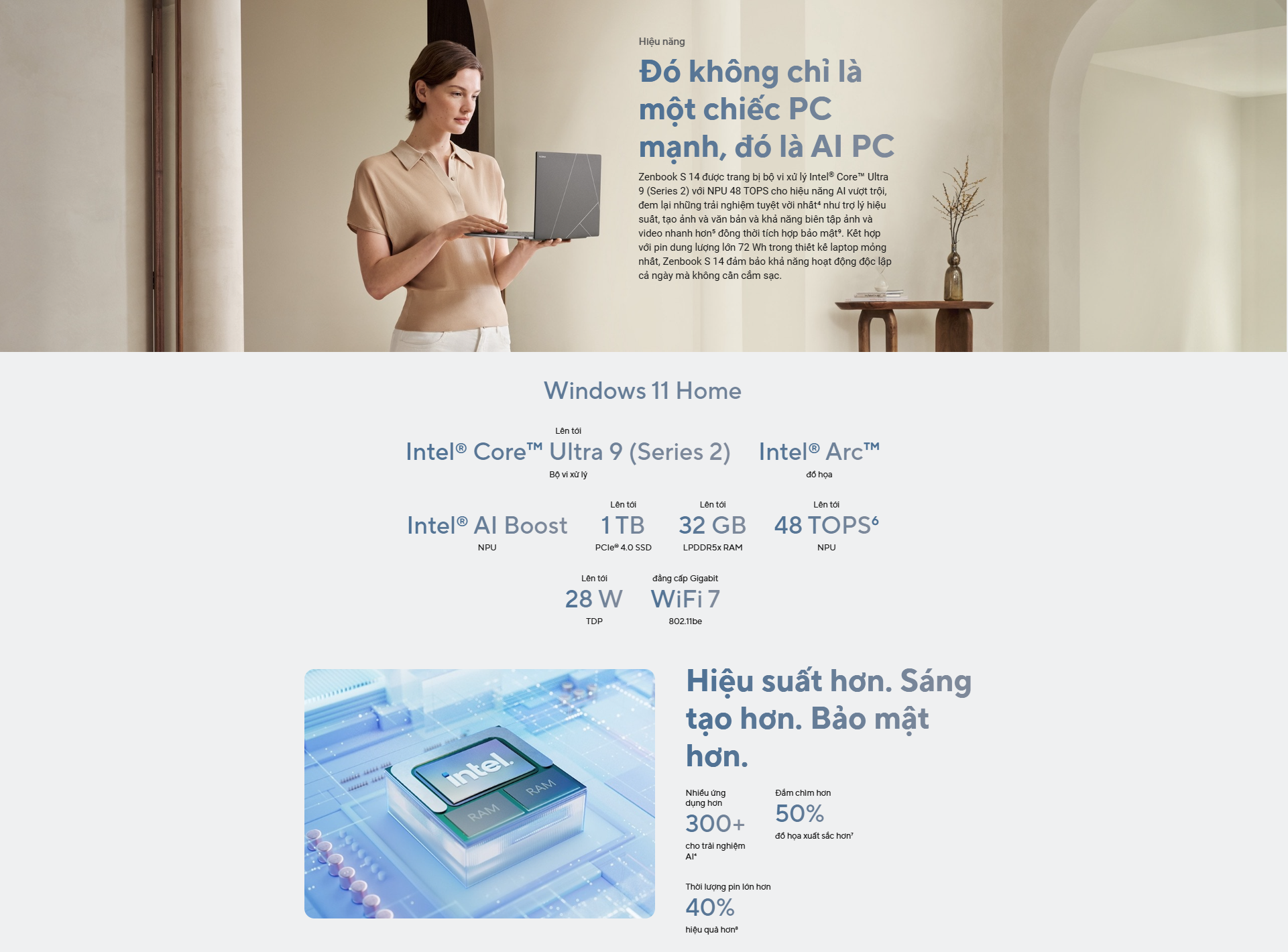 - Hiệu năng AI đột phá từ Intel Core Ultra: Sản phẩm được trang bị bộ vi xử lý Intel Core Ultra 7 258V mới nhất, thuộc dòng Intel Ultra Series. CPU này không chỉ có hiệu suất xử lý mạnh mẽ mà còn tích hợp nhân xử lý AI chuyên dụng (NPU), cho phép tăng tốc các tác vụ liên quan đến AI như phân tích dữ liệu, xử lý hình ảnh, và sử dụng trợ lý ảo Copilot một cách mượt mà và tiết kiệm năng lượng hơn. Với Zenbook S14, bạn có thể dễ dàng làm việc với các phần mềm văn phòng, chỉnh sửa ảnh, video cơ bản và đa nhiệm linh hoạt.