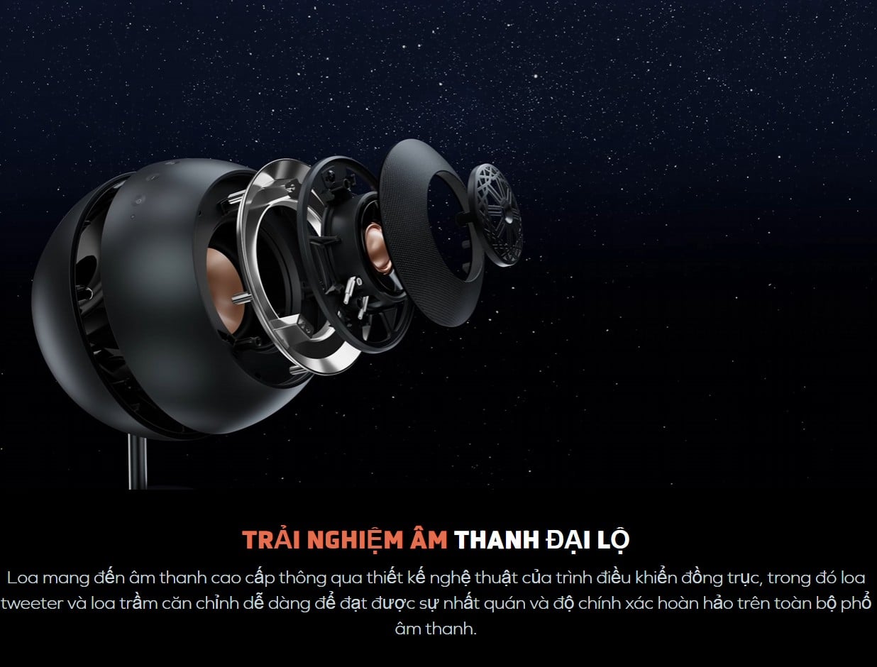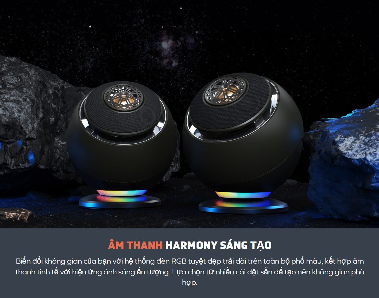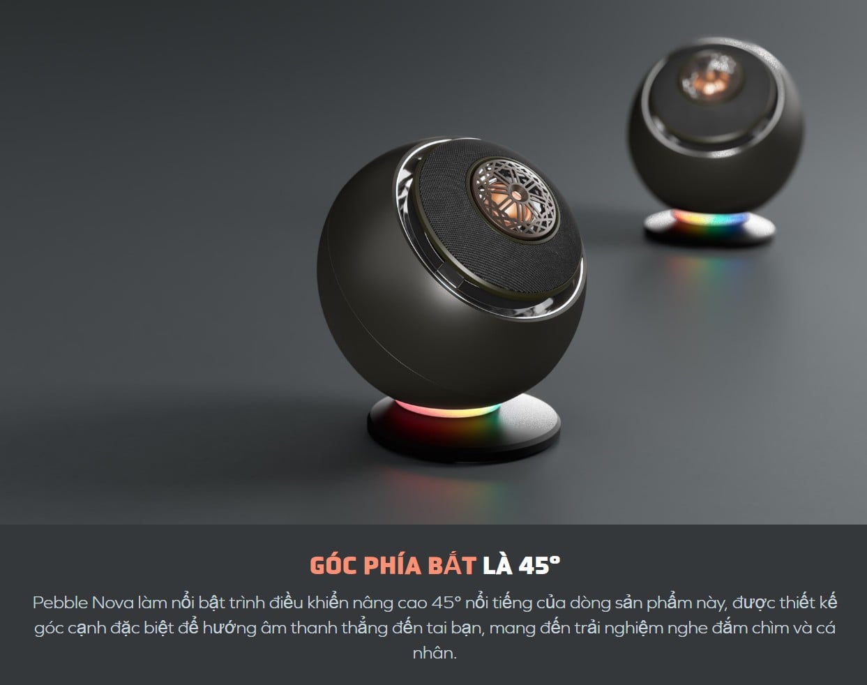 Loa giữ nguyên thiết kế hình cầu nghiêng 45 độ đặc trưng, giúp hướng âm thanh trực tiếp đến tai người nghe, tối ưu hóa trải nghiệm âm thanh trên bàn làm việc. Điểm nhấn là dải LED RGB quanh viền loa với 16.8 triệu màu, giúp bạn dễ dàng đồng bộ hóa ánh sáng với không gian giải trí cá nhân.